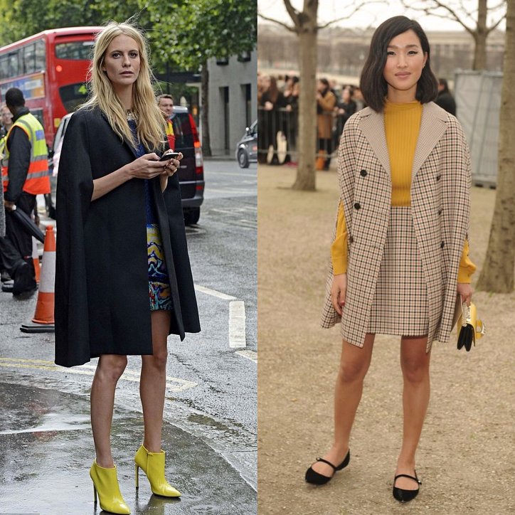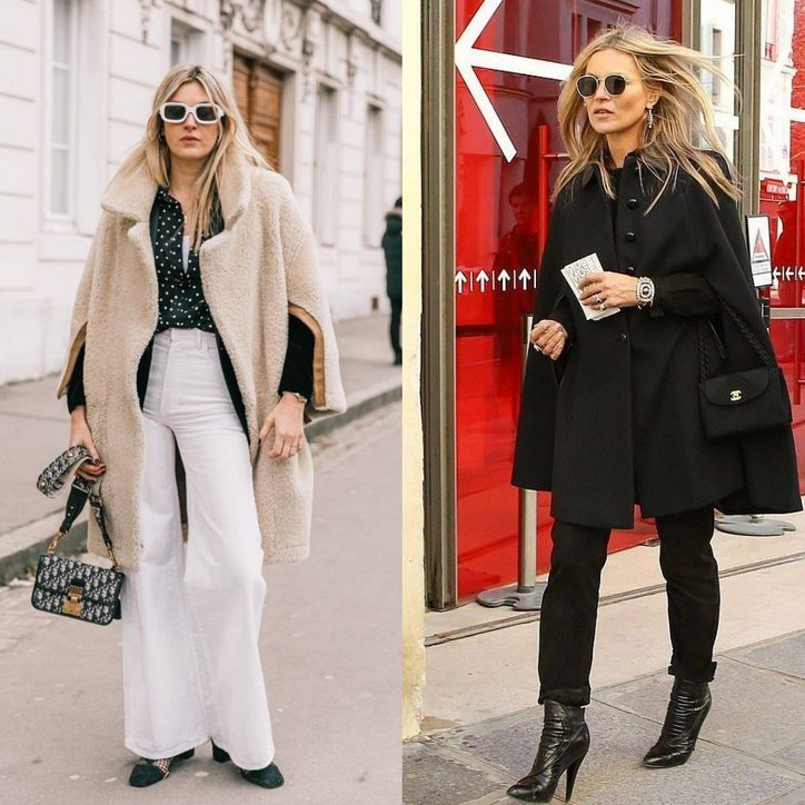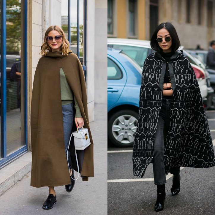 Так как кейп – пальто свободного кроя, то стилисты рекомендуют сочетать его с зауженным «низом»: леггинсами, джинсами скинни, узкими прямыми брюками, юбкой-карандаш или платьем-футляром (чуть длиннее кейпа или такой же длины).