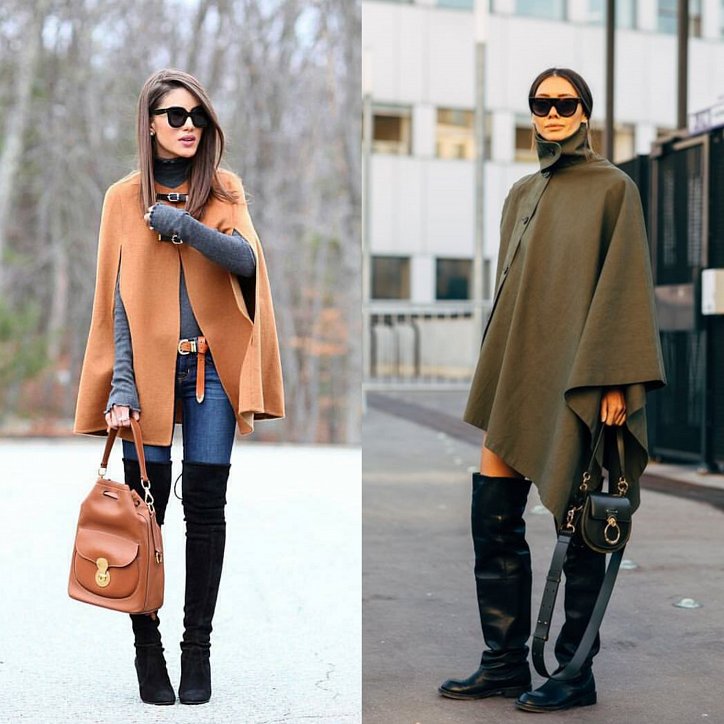 Что же касается аксессуаров, то прекрасно смотрятся с кейпами высокие сапоги-ботфорты и длинные перчатки, которые не только придадут образу шика, но и выступят «заменителем» отсутствующих рукавов.