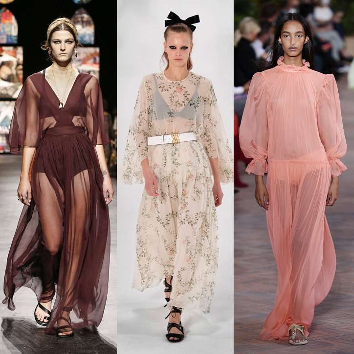 Очень смелое решение, но просто идеальное для лета. Дизайнеры Christian Dior, Alberta Ferretti, Giambattista Valli и многие другие предлагают использовать для летних платьев полностью прозрачные материалы, которые ничего не скрывают. Тюль, шифон, кружевные материалы буквально заполонили подиумы. Оттенки тканей могут быть любыми, начиная от белого цвета и пастельных тонов, и заканчивая самыми яркими и даже черным цветом. В прозрачной черной ткани летом не должно быть жарко. Длину лучше выбирать миди или даже макси, тем более что ткань просвечивает.