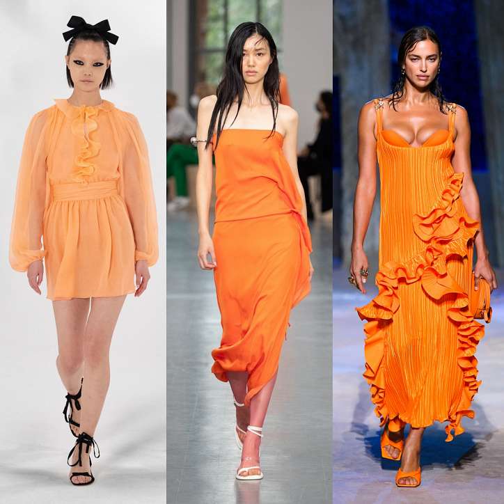 Оранжевые оттенки буквально заполонили подиумы. Причем можно подобрать именно тот тон оранжевого, который подойдет к цветотипу вашей внешности. Это может быть оттенок янтаря, теплый и сдержанный, может быть более темный оттенок ржавчины или, наоборот, яркий неоновый цвет сочного апельсина. Versace и Sportmax выбрали оранжевые оттенки для своих платьев, а в целом оранжевый цвет хорошо смотрится на любой вещи, а также на ярких летних аксессуарах.