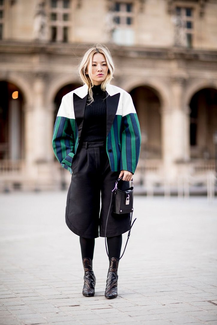 Женские ковбойские сапоги плюс джинсы – это все ожидаемо и привычно. А вот укороченные широкие брюки с темными непрозрачными колготками – это уже что-то новенькое.