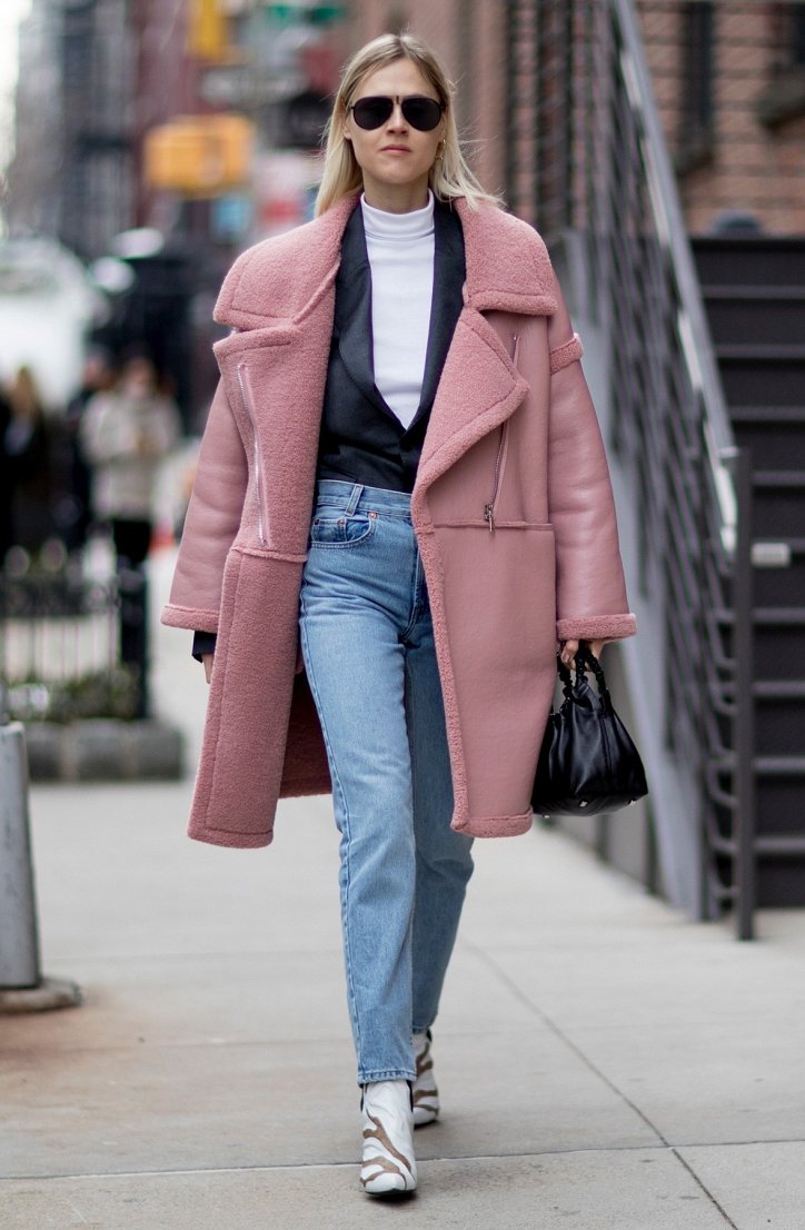 Неожиданно будет выглядеть и сочетание сапог с джинсами и розовой дубленкой. Остроты образу добавят белая водолазка с черной жилеткой.