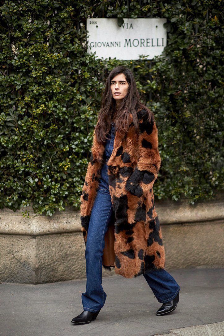 Даже классический лук «а-ля Дикий Запад» – джинсы, рубашка из денима и сапоги – можно разнообразить, «приправив» его необычным пальто из «пятнистого» меха.