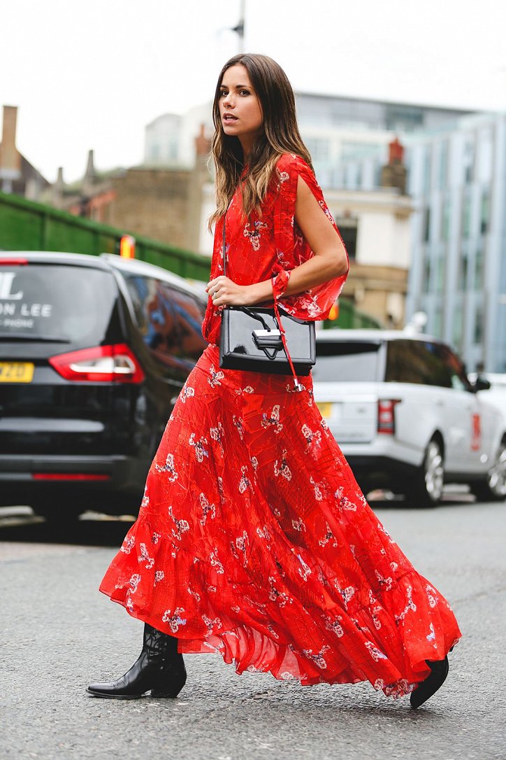 Совсем не обязательно носить cowboy boots только с джинсами и курткой с бахромой. Великолепно смотрятся они с ярким макси-платьем в цветочек.
