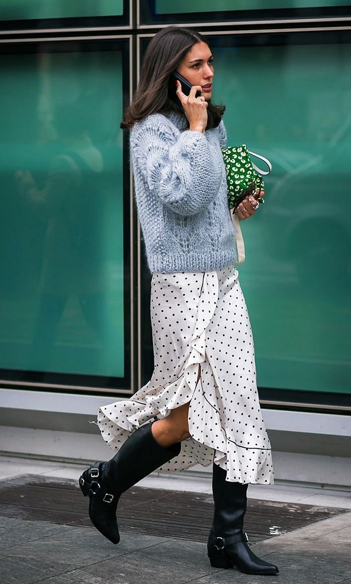Еще один способ добавить к образу не только эклектики, но и женственности – надеть ковбойские сапоги с юбкой миди и вязаным пуловером с узорами.