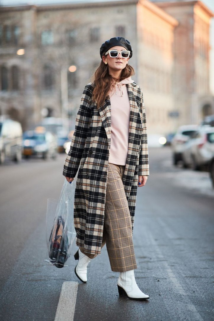 Очаровательный микс получится, если белые сапоги надеть с типично городским ансамблем из клетчатого пальто и укороченных брюк, нейтрального цвета худи и дополнить образ романтическим беретом.