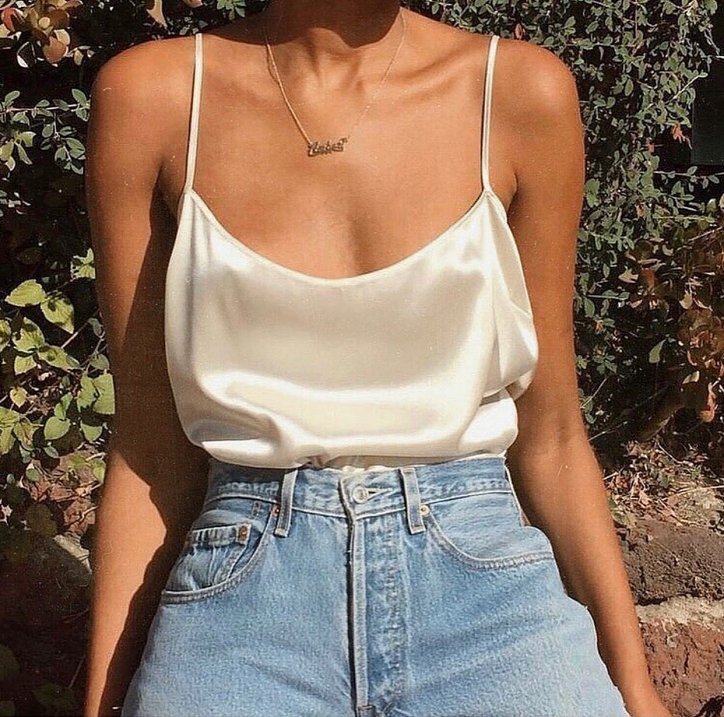 - тоненькие бретельки топов будут привлекать внимание к плечевой зоне, а из-за контраста объемов будут визуально делать зону плеч больше. То же самое относится к топам-халтерам;