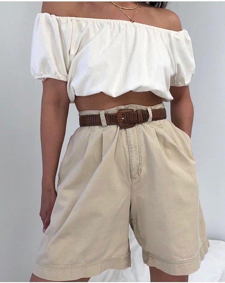 - горизонтальные линии в образе: это могут быть полоски на тельняшке, спущенные плечи блузы или короткое украшение;