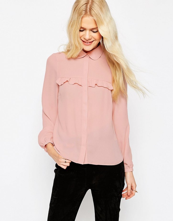 Если вам нравятся женственные романтичные блузы, то обратите внимание на модель с оборками и маленьким круглым воротником от ASOS.