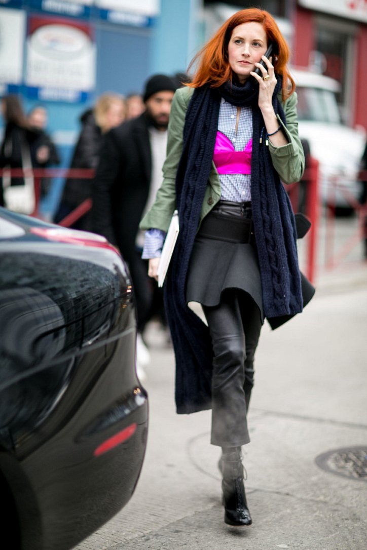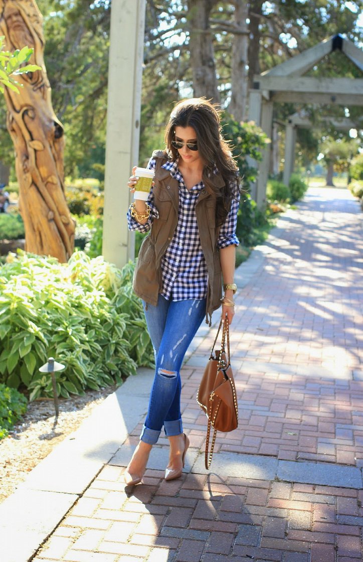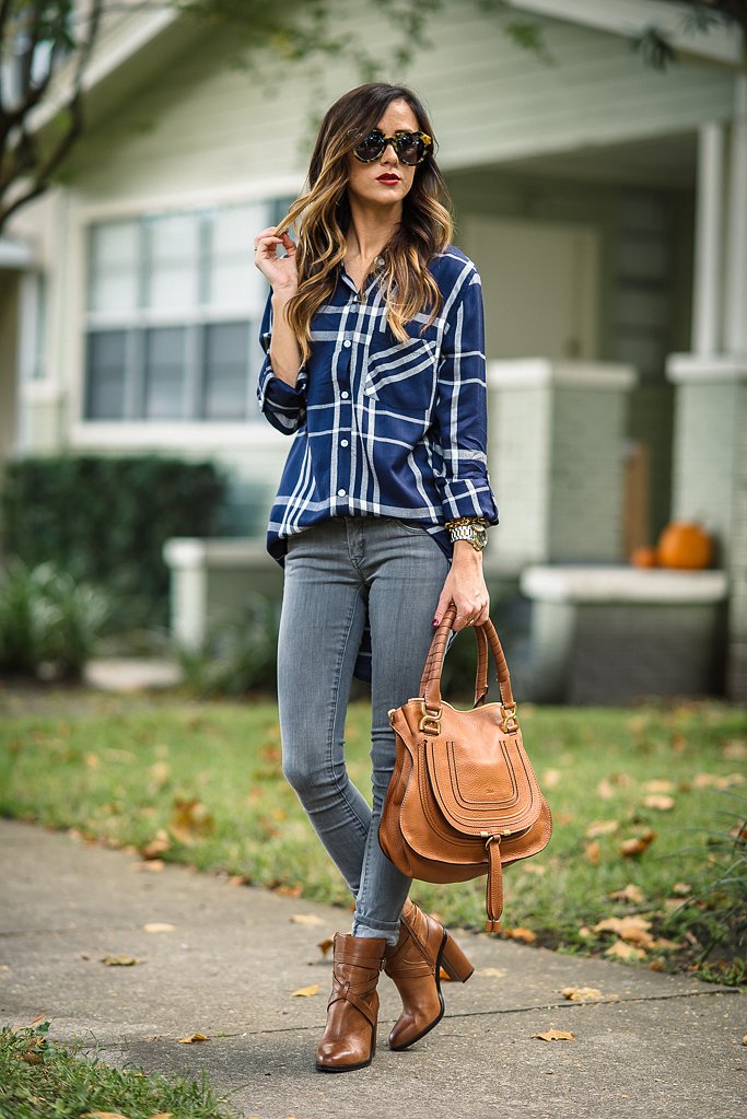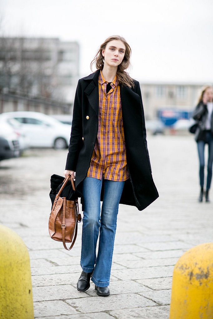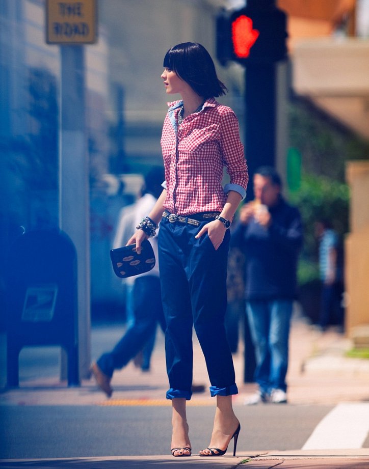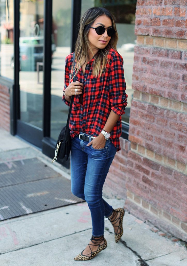 Идеальная пара для клетчатой рубашки свободного кроя – узкие брюки. Джинсы, леггинсы и облегающие брючки позволяют «поиграть» с полами: рубашку можно носить заправленной или навыпуск, а можно забрать «под пояс» только одну полу. Добавить кокетства и сексуальности к образу можно расстегнув пуговицы (частично или полностью) и закатав рукава.