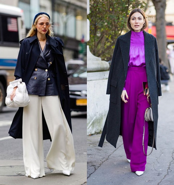 В межсезонье и холодную пору брюки-палаццо органично будут смотреться с водолазкой и тонким пуловером или джемпером, кожаной курткой или свободного кроя блейзером. При выборе верхней одежды ориентируйтесь на пальто прямого кроя.