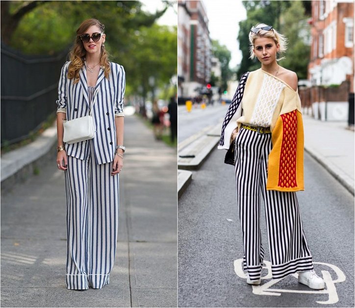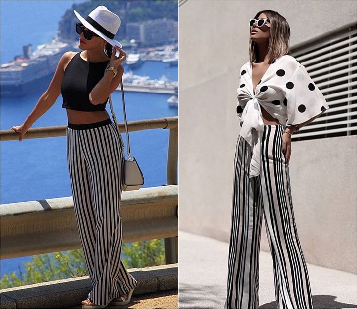 Широкие брюки в полоску можно носить с однотонным верхом, повторяющим цвет полоски, или смиксовать принты (например, с горошком или такой же полоской, но с другим направлением).