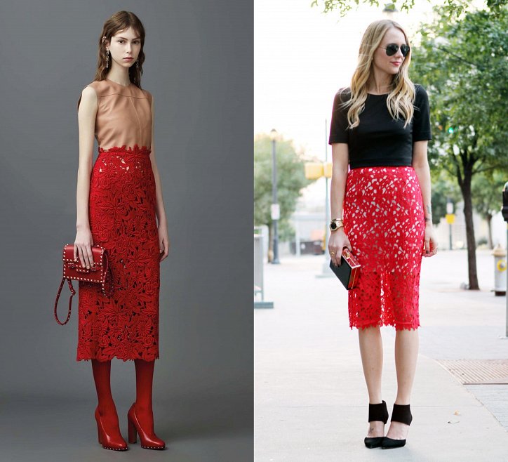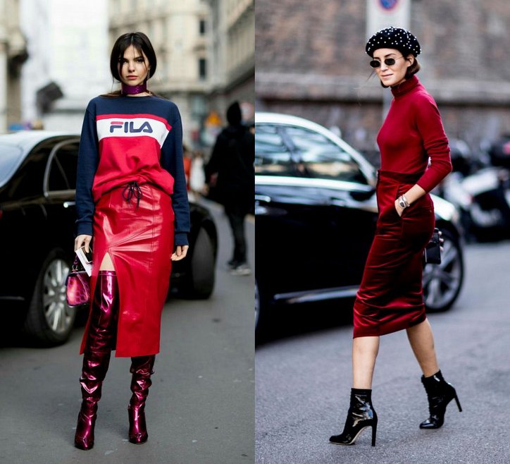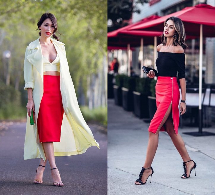 Красная юбка-карандаш из атласа или кружева – прекрасный выбор для похода в театр, ресторан или на презентацию. «Верх» в этом случае должен быть контрастным. Подойдут и классические пары (красный плюс черный, белый или бежевый), и смелые решения (например, модное в этом году сочетание красного с розовым или фиолетовым).