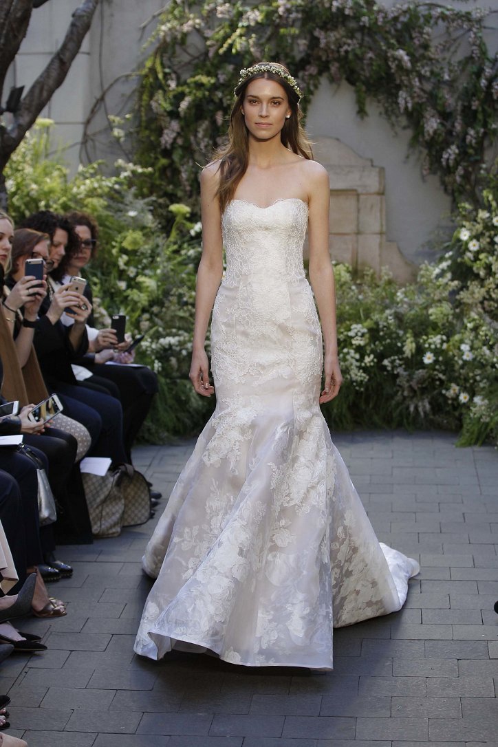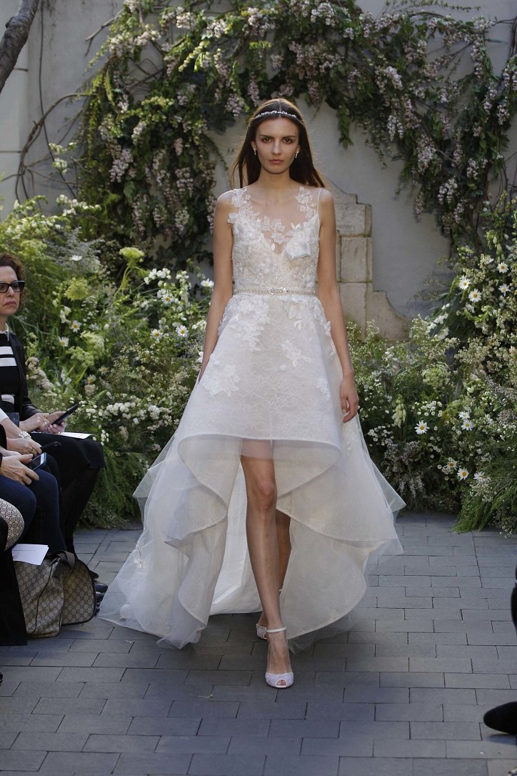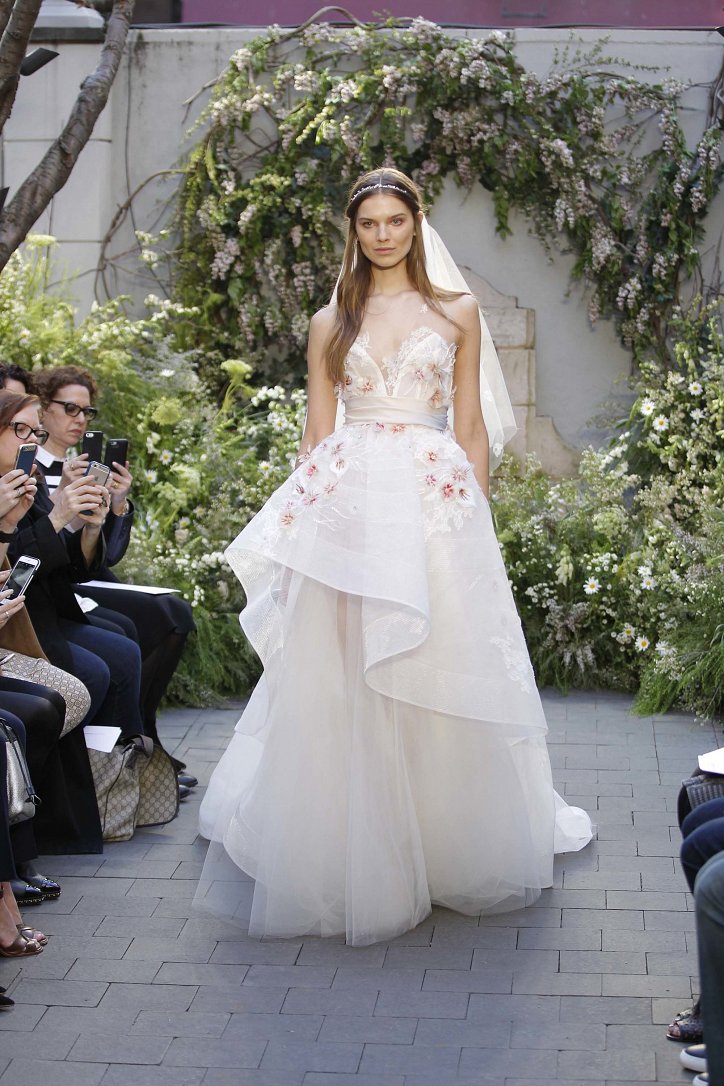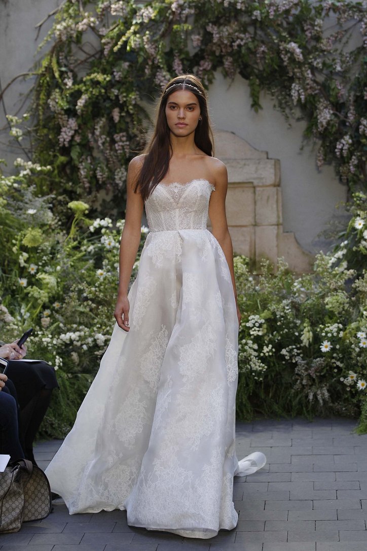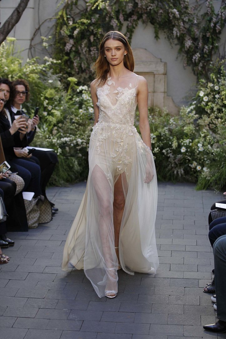 На фоне цветущих глициний проплывали нежные эфирные создания в легких белых и кремовых платьях без корсетов, «косточек» и бисерной вышивки. Вместо всех этих традиционных элементов свадебных платьев Monique Lhuillier предложила модели в бельевом стиле, лифы-иллюзии, многоярусные юбки, объемный цветочный декор, платья-маллет с юбками похожими на огромные воланы, обольстительные кружевные платья-«русалки» и даже комбинезон с отстегивающейся юбкой из воздушного тюля!