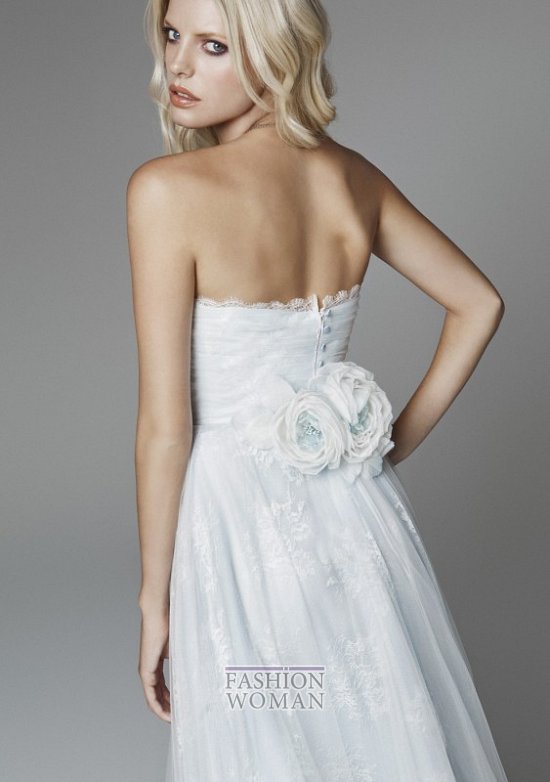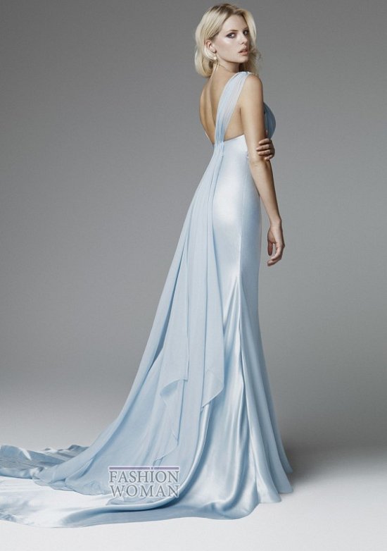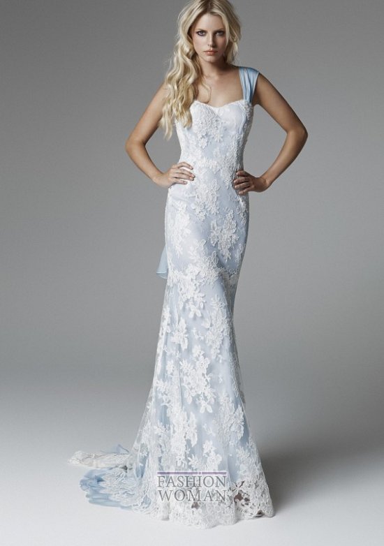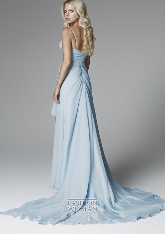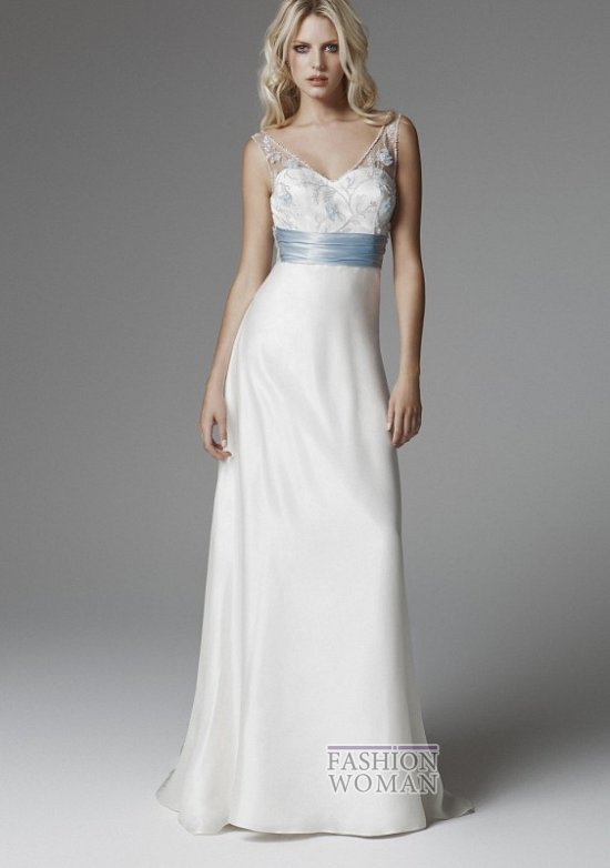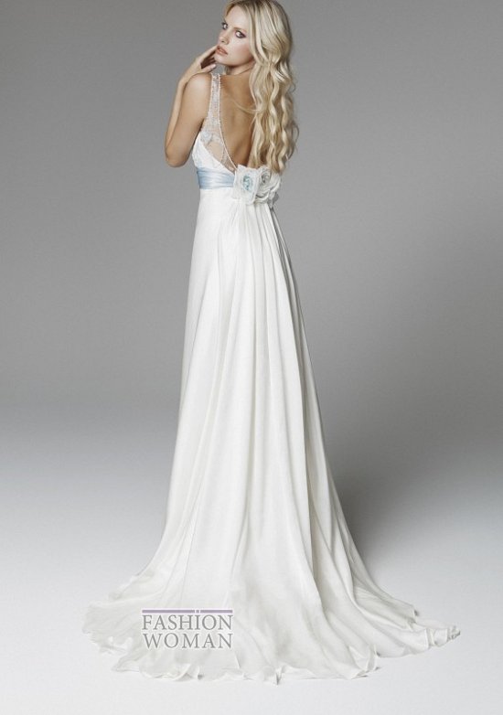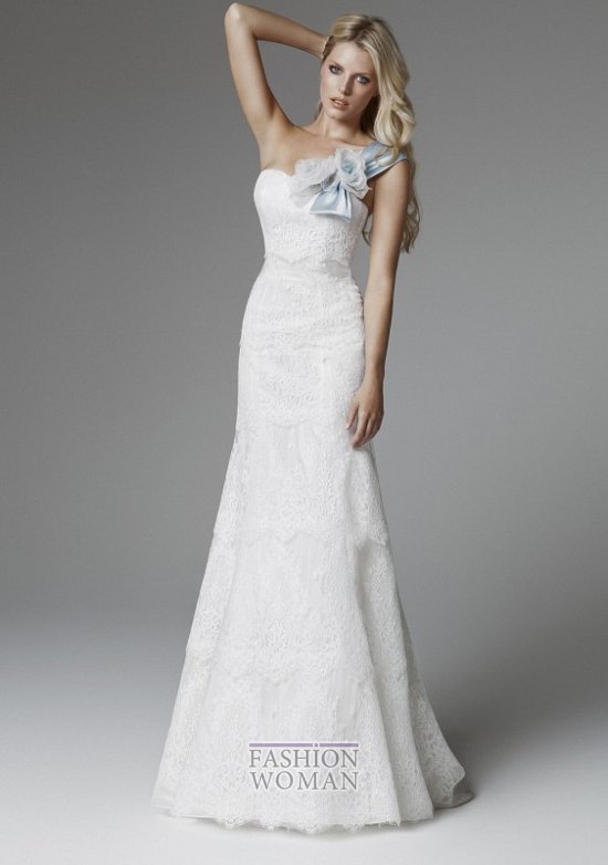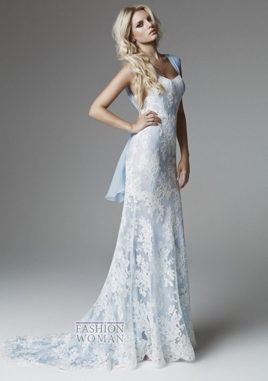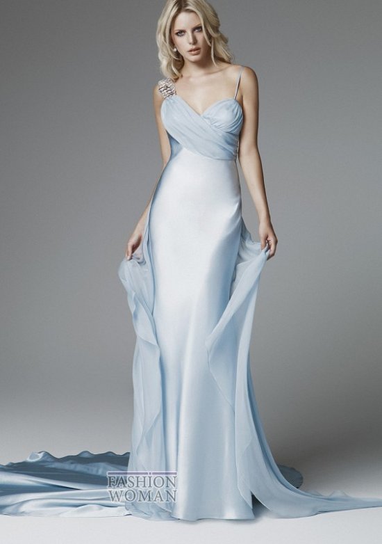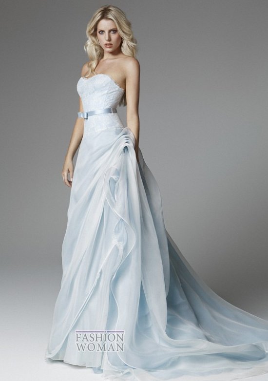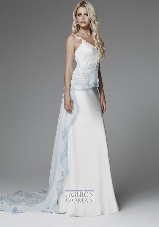В новую коллекцию итальянской марки Blumarine вошли нежные и утонченные свадебные платья из струящегося шелка, атласа, шифона, тафты и изысканного кружева. Основным цветом коллекции стал бледно-голубой.