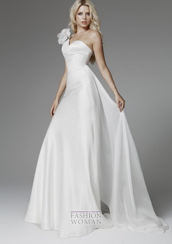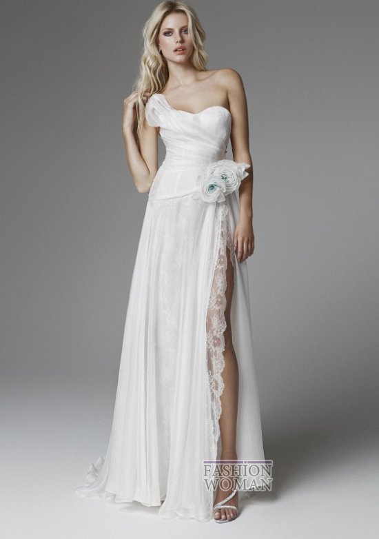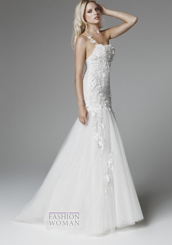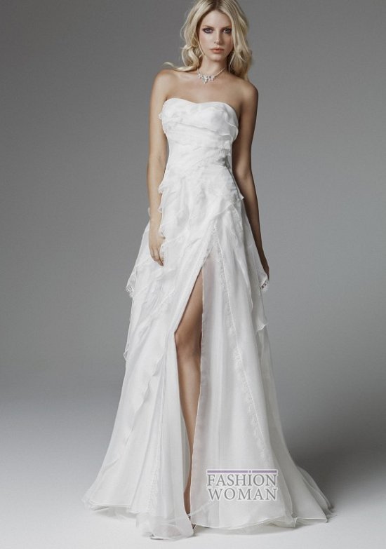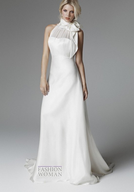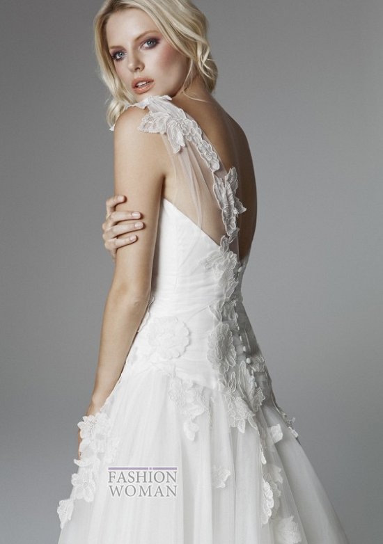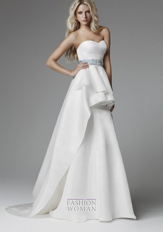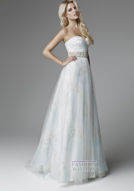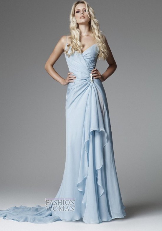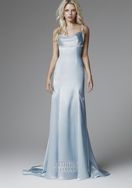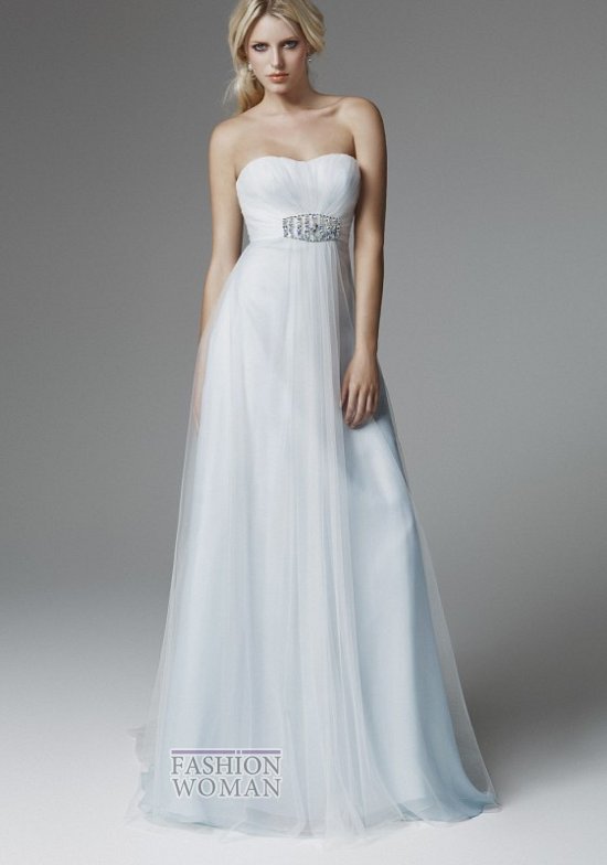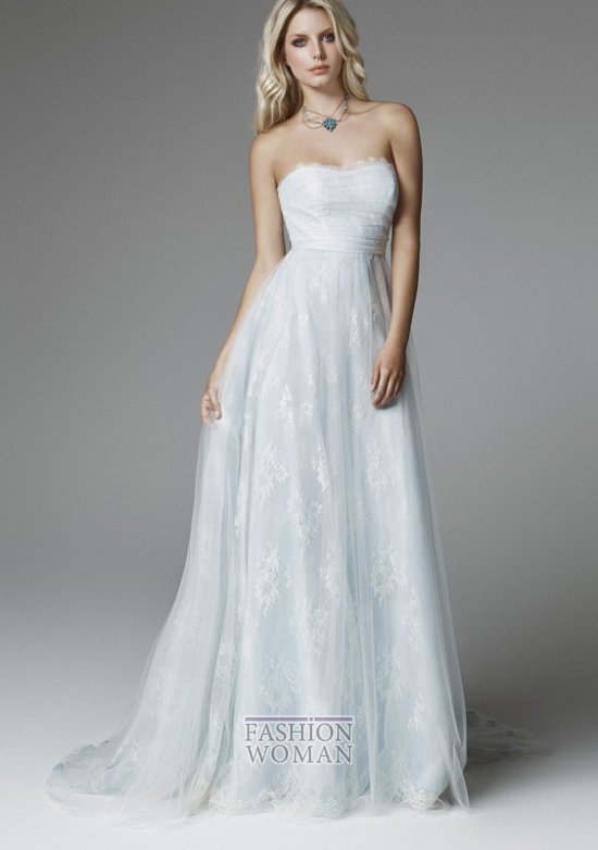 В новую коллекцию итальянской марки Blumarine вошли нежные и утонченные свадебные платья из струящегося шелка, атласа, шифона, тафты и изысканного кружева. Основным цветом коллекции стал бледно-голубой.