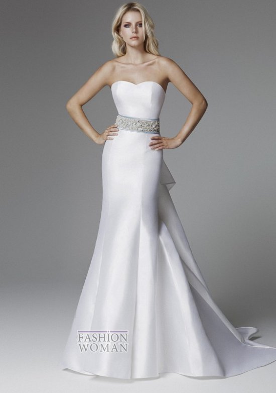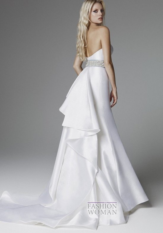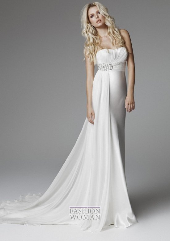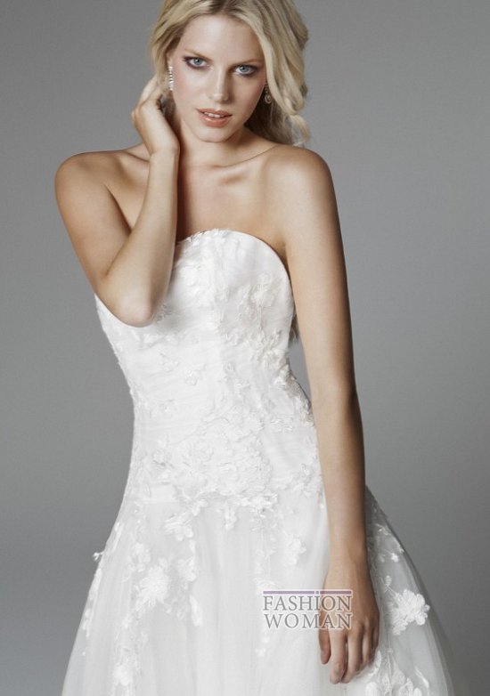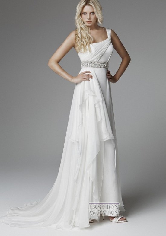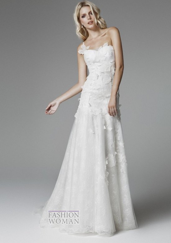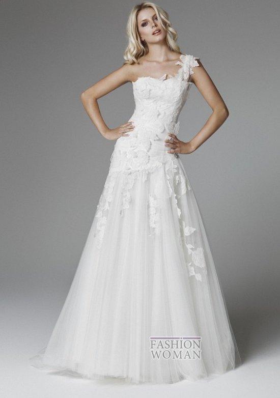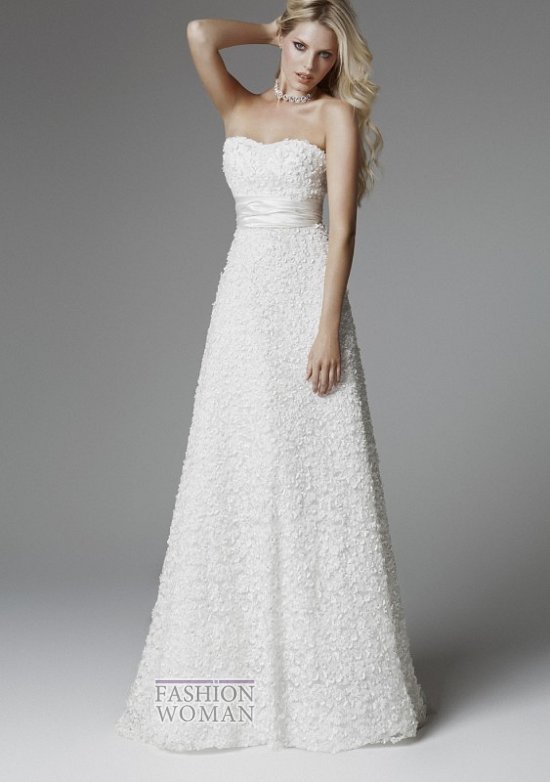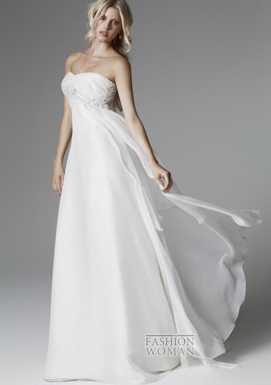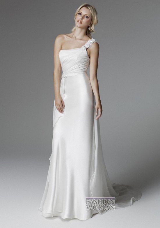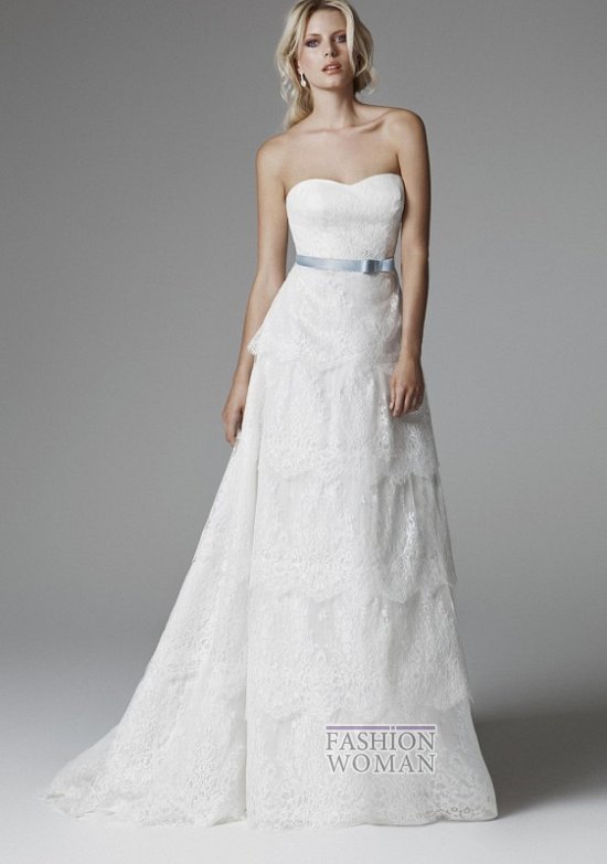 В новую коллекцию итальянской марки Blumarine вошли нежные и утонченные свадебные платья из струящегося шелка, атласа, шифона, тафты и изысканного кружева. Основным цветом коллекции стал бледно-голубой.
