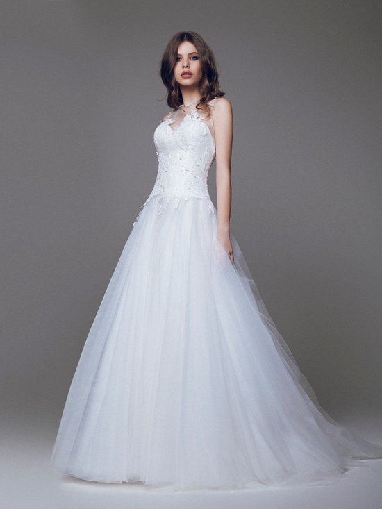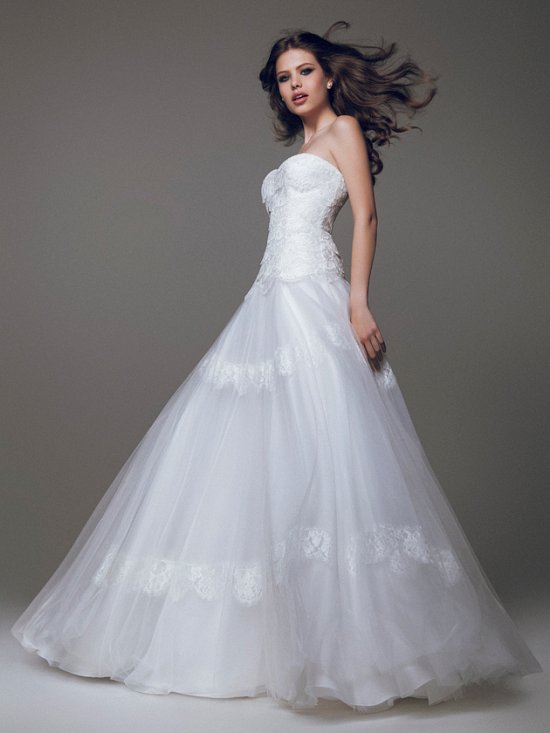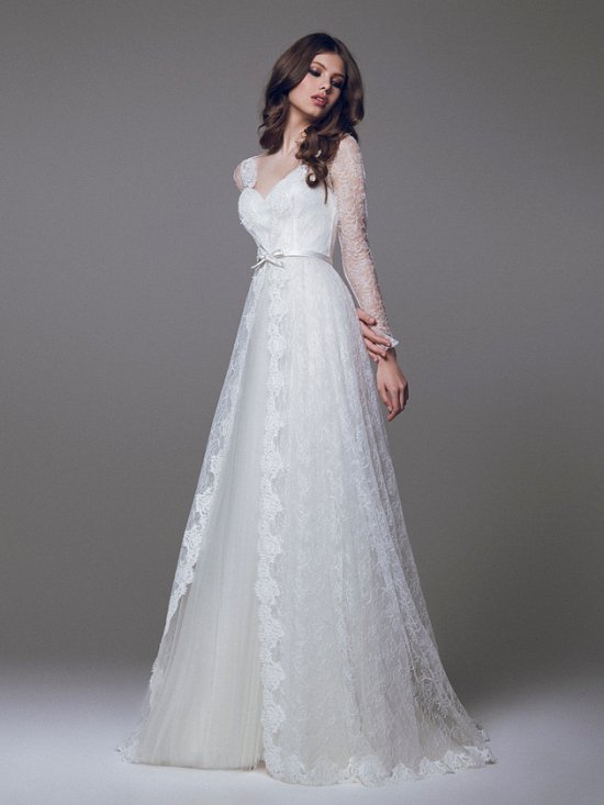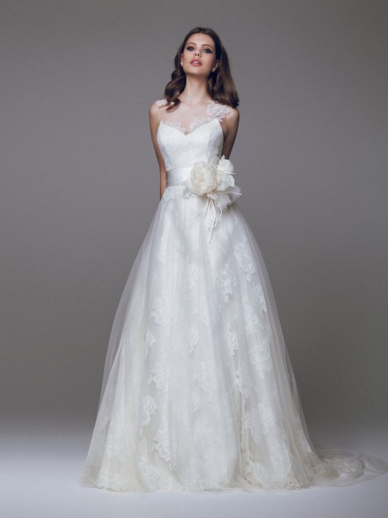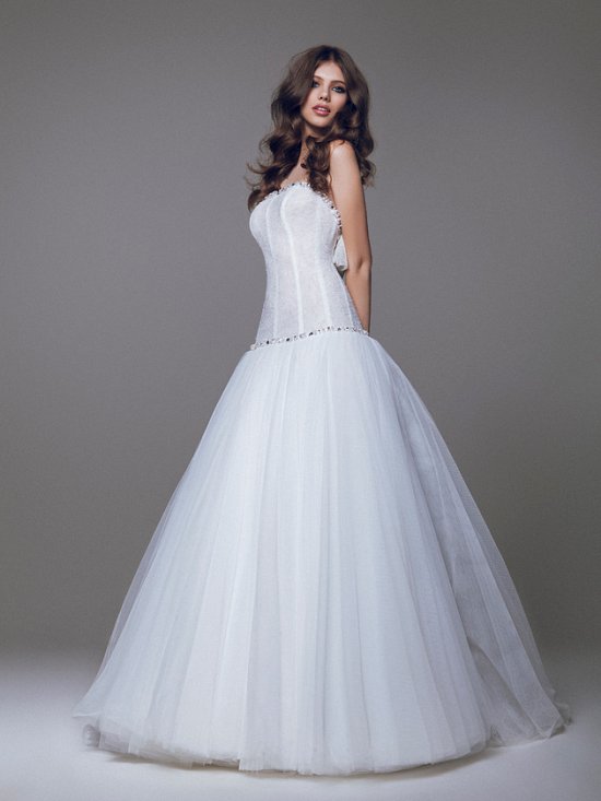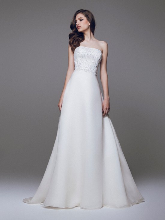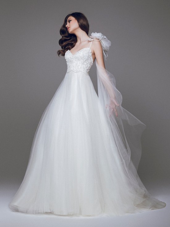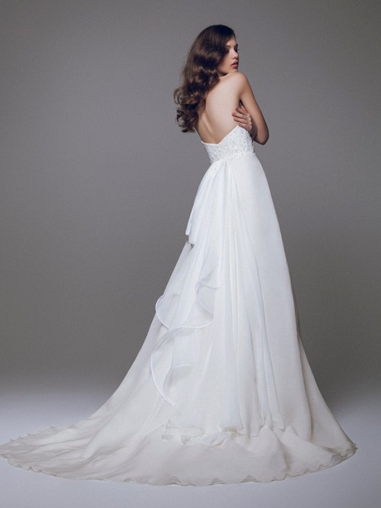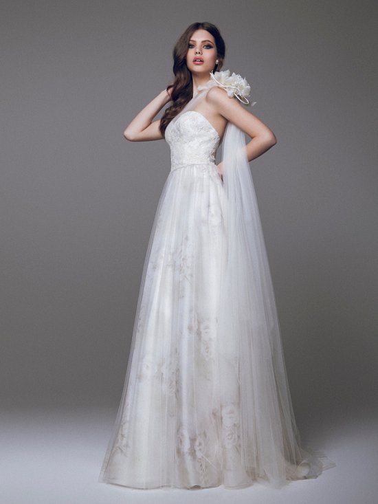 Удивительно красива и цветовая палитра свадебных платьев: в ней есть и белоснежные наряды, и модели цвета слоновой кости, и платья оттенка шампань, и хит коллекции – платье с едва заметным нежным акварельным рисунком.