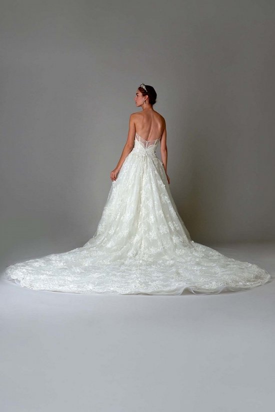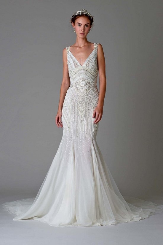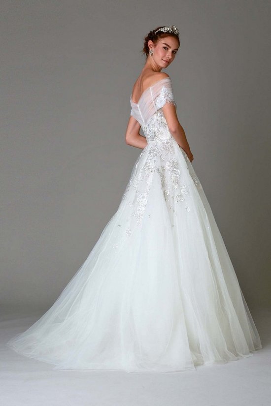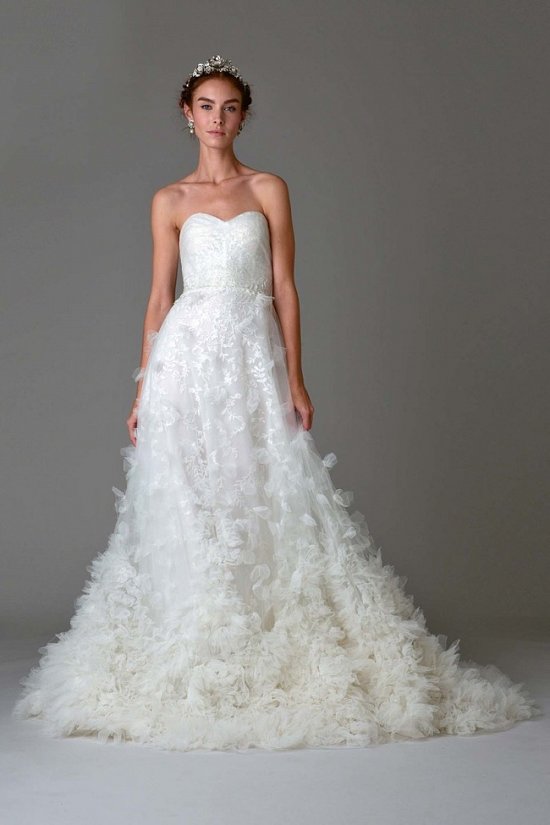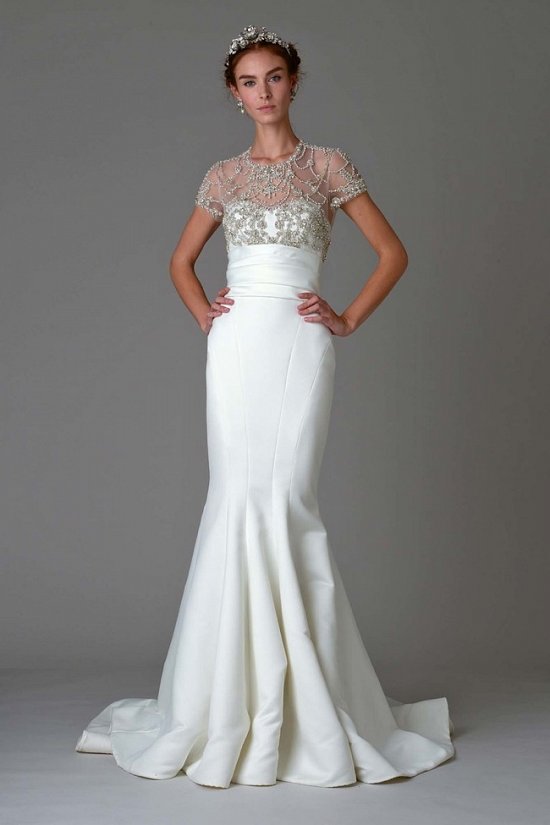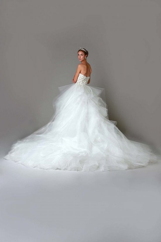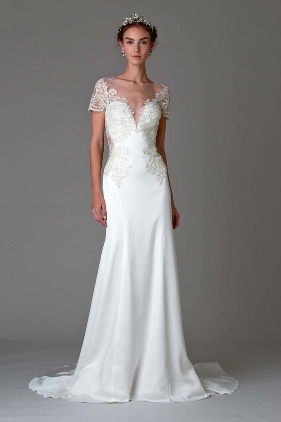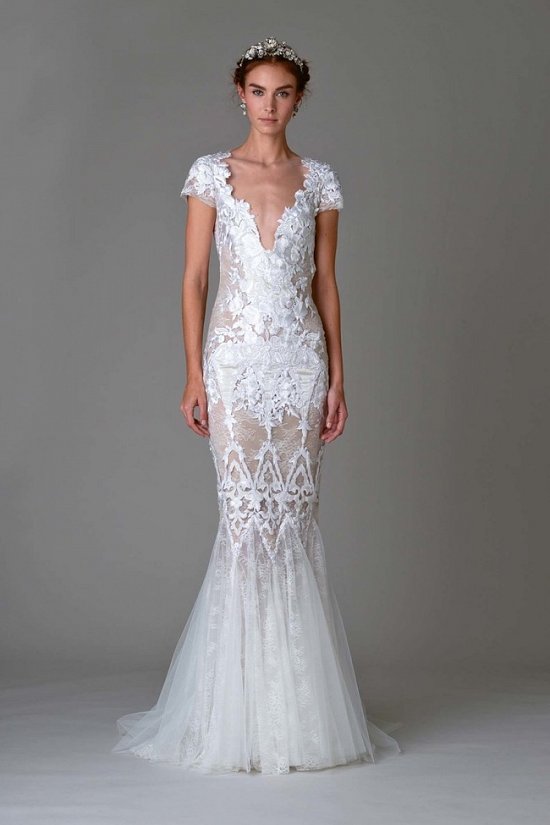 Платья-"русалки", "принцессы", модели A-силуэта, а также короткие свадебные платья созданы из шелка, тафты и тюля, дополнены нежным кружевом, ручной вышивкой, кристаллами и пайетками.