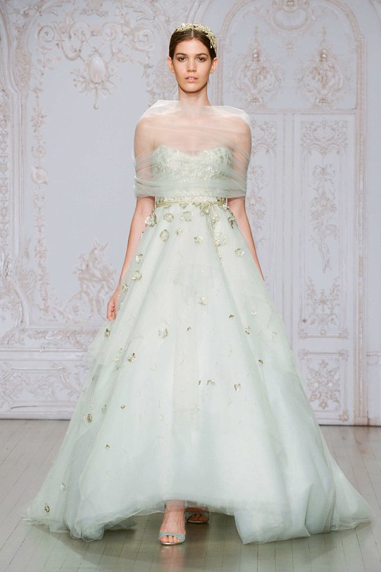 Пастельные оттенки мяты, лаванды, шампанского, античного золота и румян – игра с тонкими цветовыми оттенками стала главной «изюминкой» новой свадебной коллекции Monique Lhuillier осень-зима 2015-2016 .