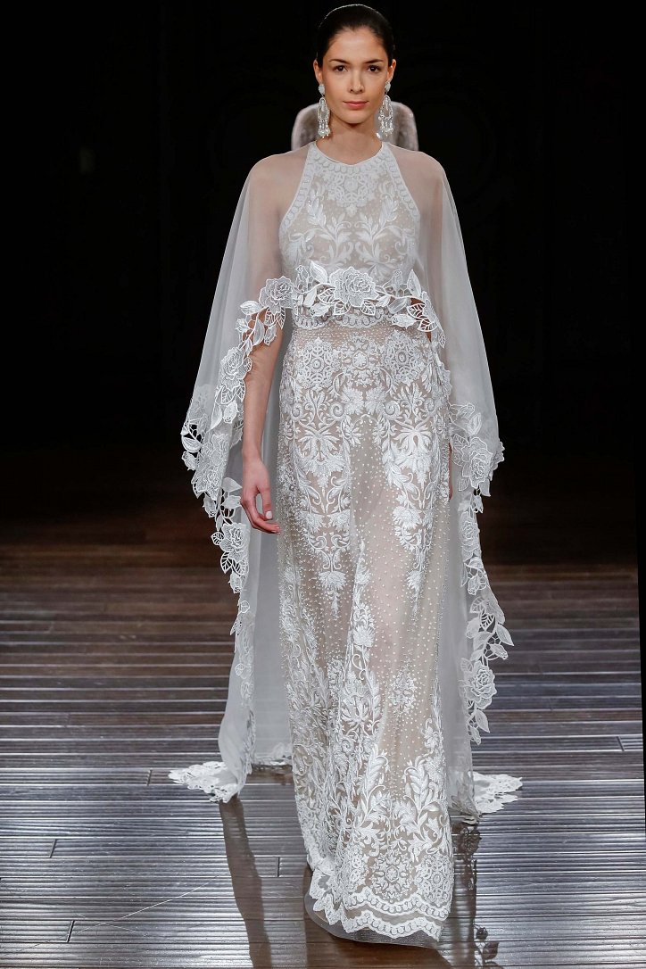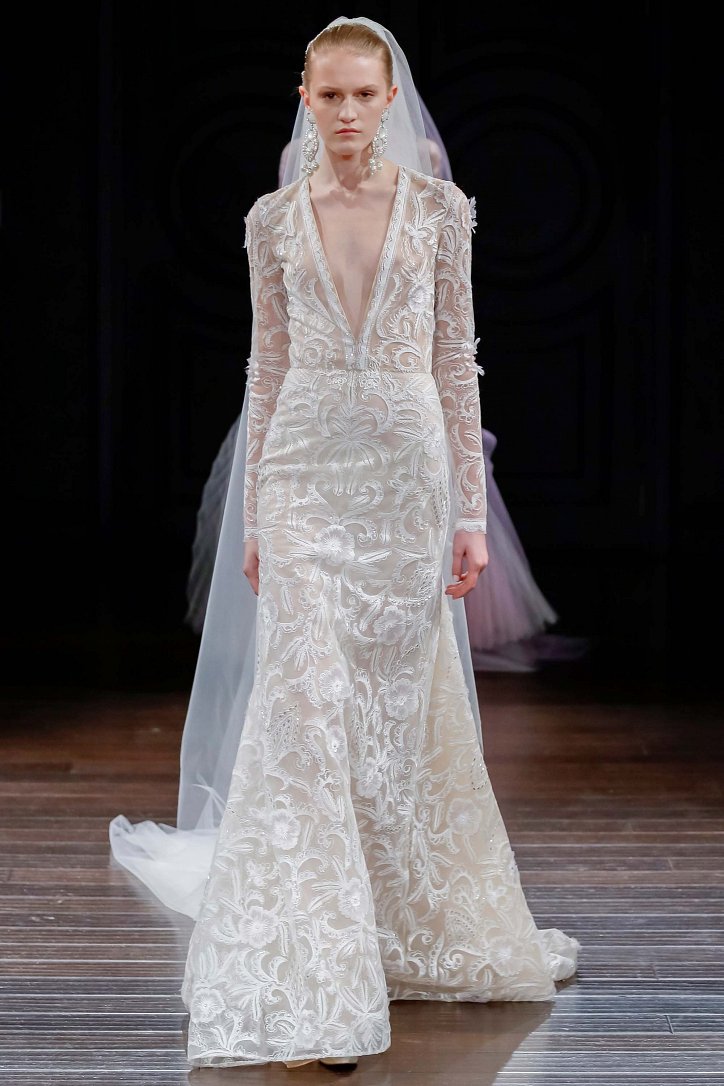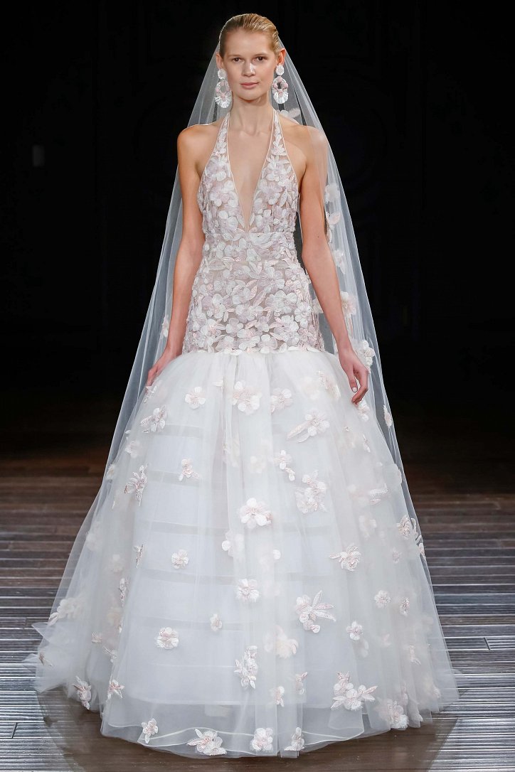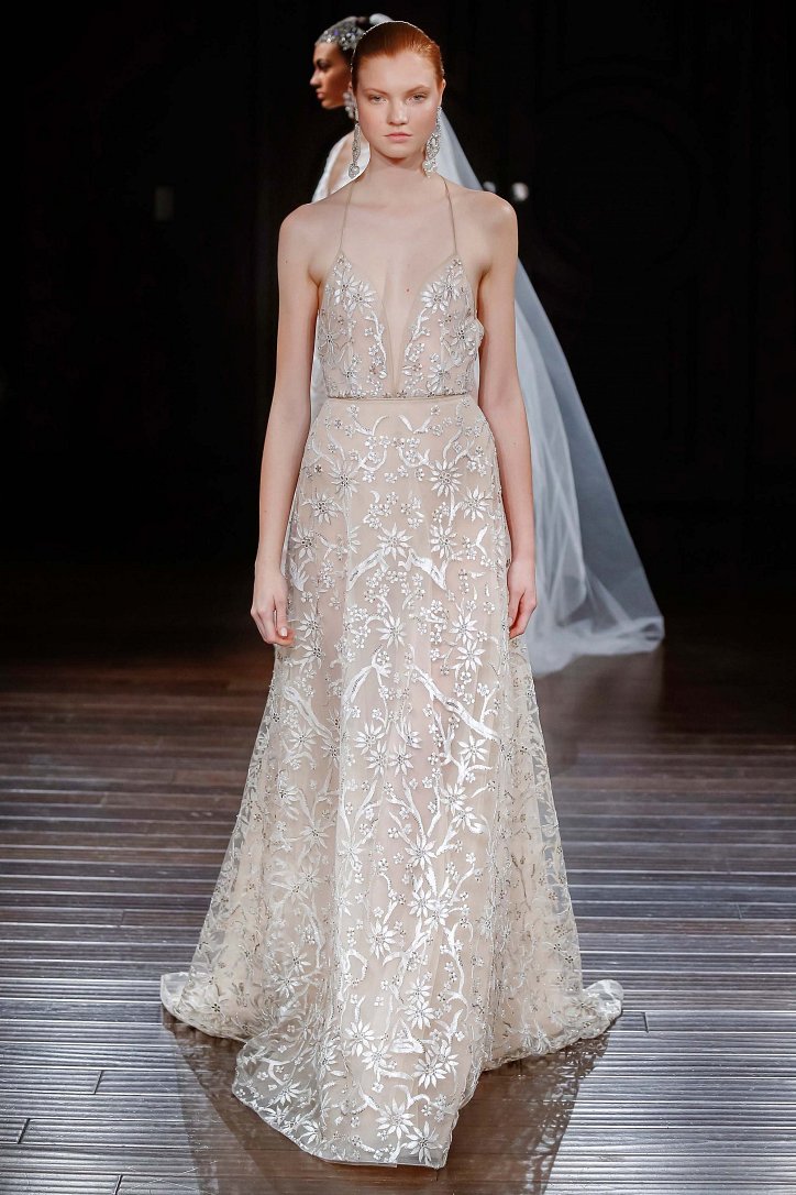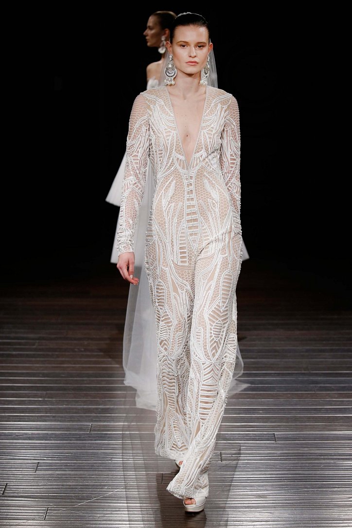 Новая свадебная коллекция Naeem Khan получилась очень необычной, оригинальной и разноплановой. В ней были не только роскошные длинные свадебные платья, которыми так славится дизайнер, но и очаровательные модели чайной длины с юбками-плиссе, и экстравагантное мини-платье, сплошь покрытое серебристой бахромой, и оригинальный комплект из вышитой туники и леггинсов, и даже комбинезон! Свадебные платья Naeem Khan, украшенные потрясающим объемным декором и искусной вышивкой, в очередной раз демонстрировали сложный и необычный крой и смешение двух миров, двух культур – Востока и Запада. Широким оказался и диапазон цветов: от белого и нюдовых оттенков до розово-сиреневых тонов и черного цвета.