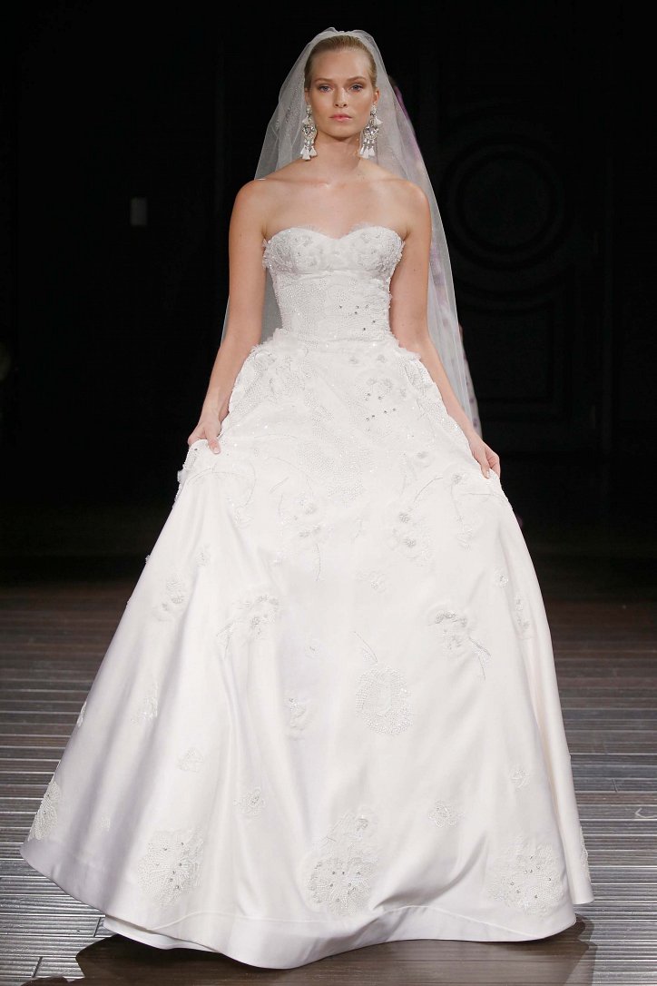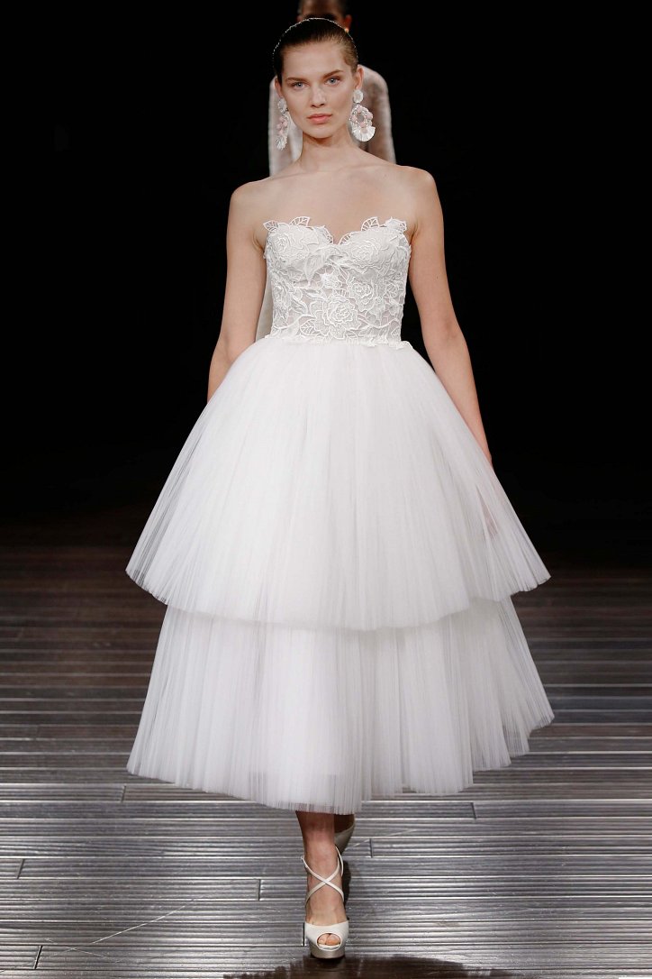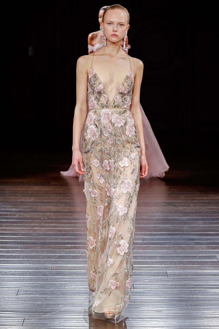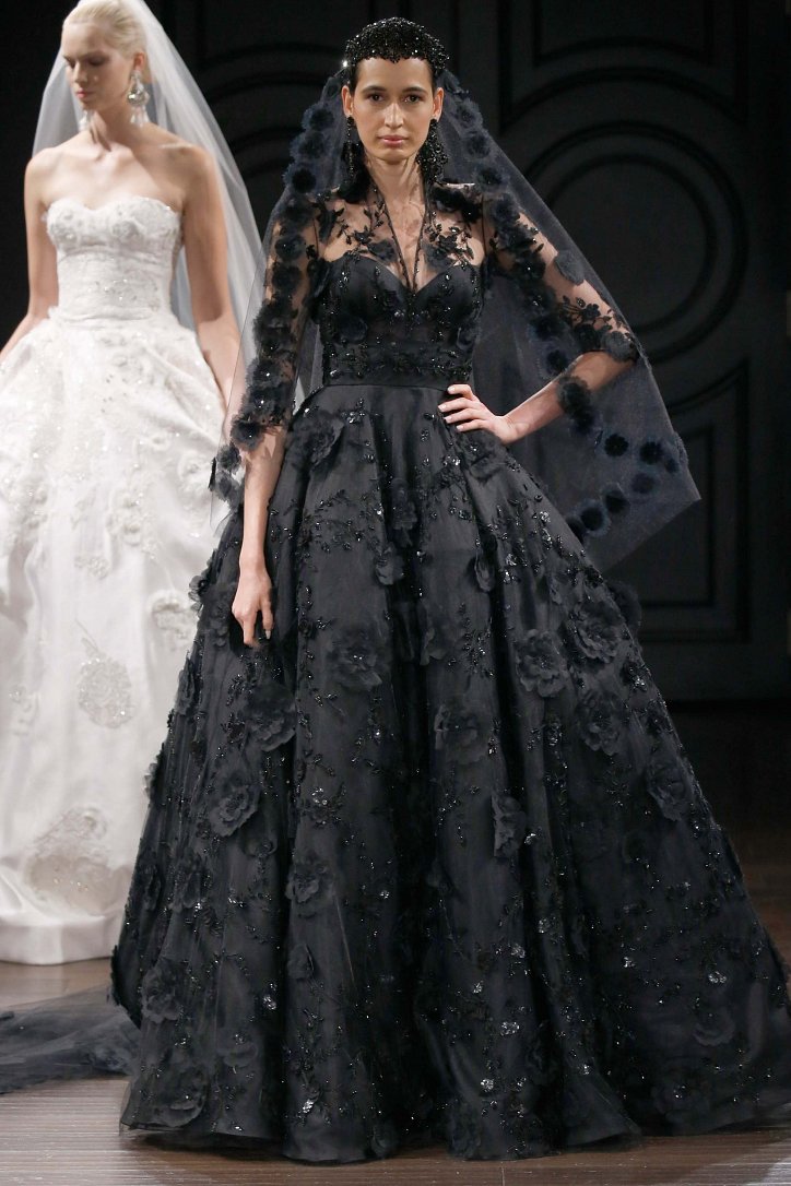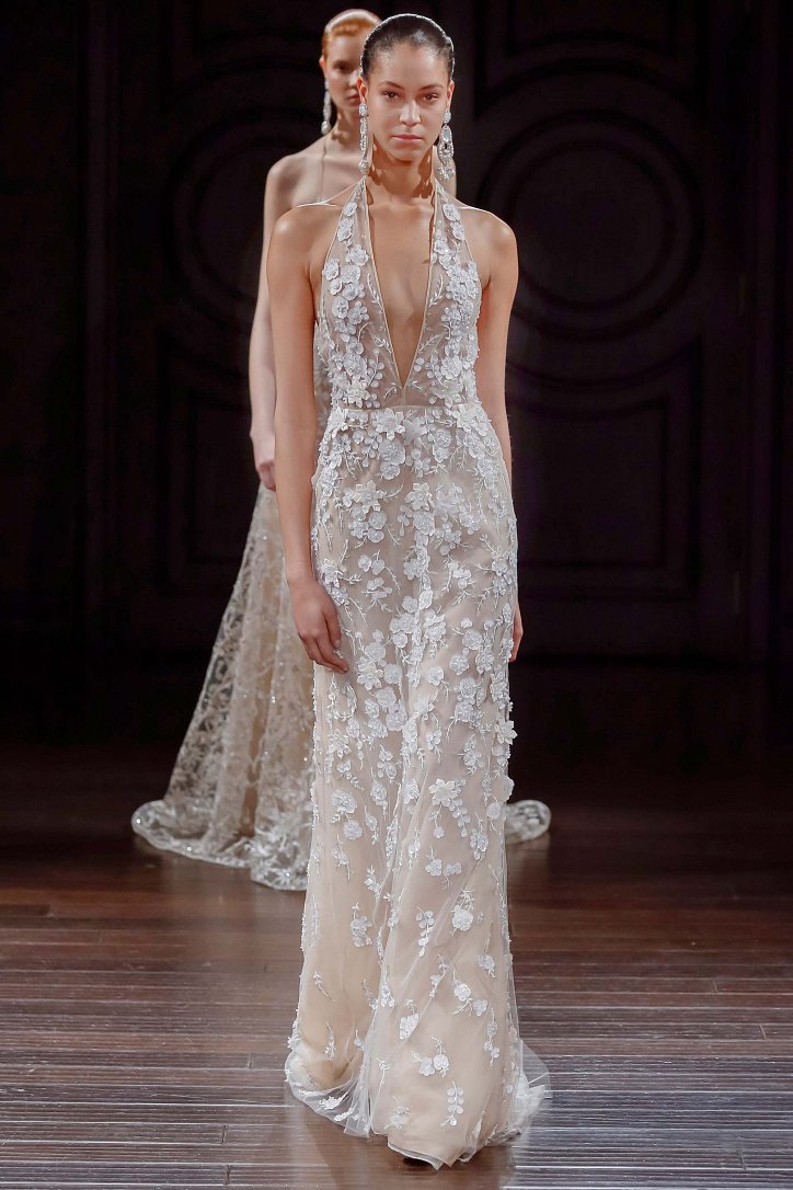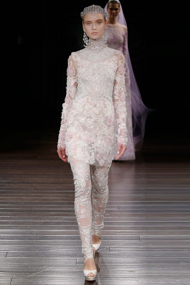 Новая свадебная коллекция Naeem Khan получилась очень необычной, оригинальной и разноплановой. В ней были не только роскошные длинные свадебные платья, которыми так славится дизайнер, но и очаровательные модели чайной длины с юбками-плиссе, и экстравагантное мини-платье, сплошь покрытое серебристой бахромой, и оригинальный комплект из вышитой туники и леггинсов, и даже комбинезон! Свадебные платья Naeem Khan, украшенные потрясающим объемным декором и искусной вышивкой, в очередной раз демонстрировали сложный и необычный крой и смешение двух миров, двух культур – Востока и Запада. Широким оказался и диапазон цветов: от белого и нюдовых оттенков до розово-сиреневых тонов и черного цвета.