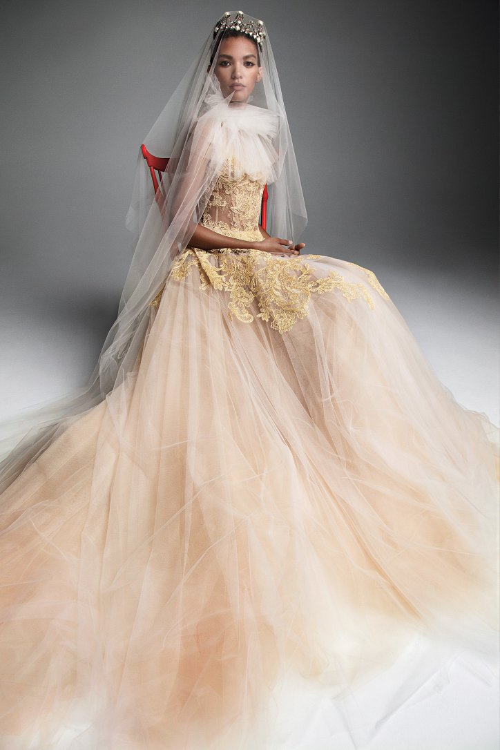 Отсылки к Версалю видны невооруженным взглядом – короны на головах невест, высокие воротники-жабо, шлейфы на платьях, похожие на королевскую мантию, пышные рукава, тюлевые юбки, «позолота» в виде вышивки, кружева, оборки и воланы.