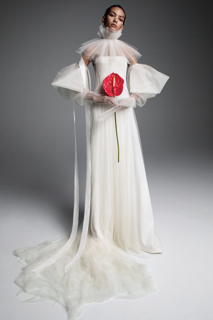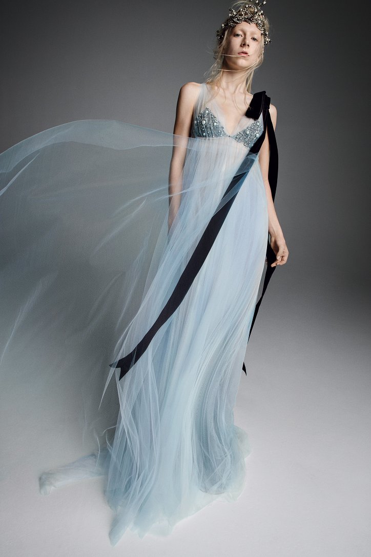 Главным цветом коллекции свадебных платьев Vera Wang осень 2019 стал нюд, но и о «чем-то голубом» дизайнер тоже не забыла – об этом свидетельствует тюлевое платье в стиле ампир.