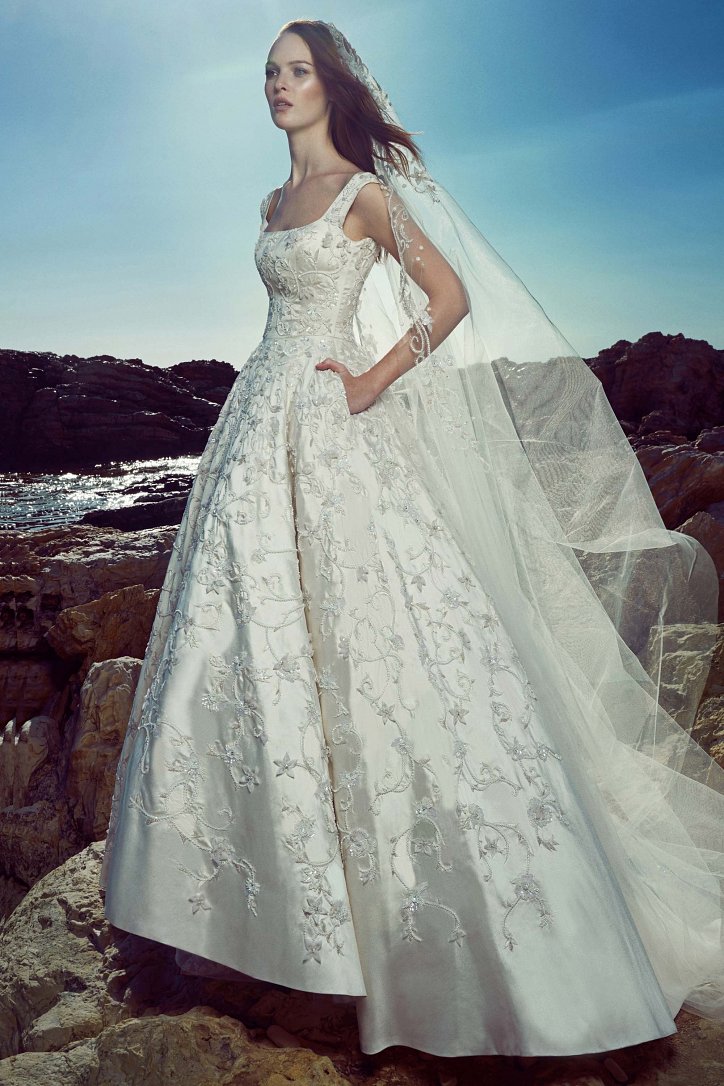 Большая часть моделей в коллекции – роскошные «бальные» платья с пышными юбками. Дизайнер сделал акцент на лифы-«иллюзии» с эффектом тату (впрочем, есть в коллекции и модели, где вышивка на прозрачном фоне занимает абсолютно всю поверхность платья!). Еще один оригинальный акцент – юбки over skirt и длинные развевающиеся фаты.