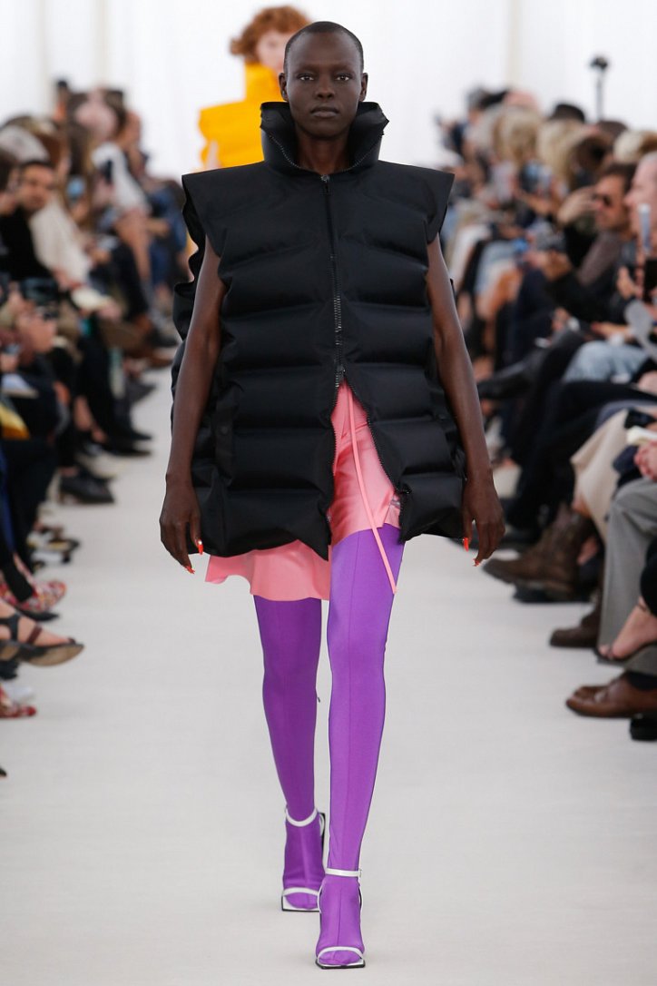 Не бойтесь и смелых сочетаний цветов! Оранжевый жакет и плотные неоново-бирюзовые колготки, сине-голубое платье с юбкой плиссе и колготки красного цвета – все это можно увидеть в коллекциях Balenciaga и Celine. Цветными колготками дизайнеры решили довершить образы, состоящие из вещей, в которых переплелись разные стили: спорт и оверсайз, бельевой стиль и мода 80-ых.
