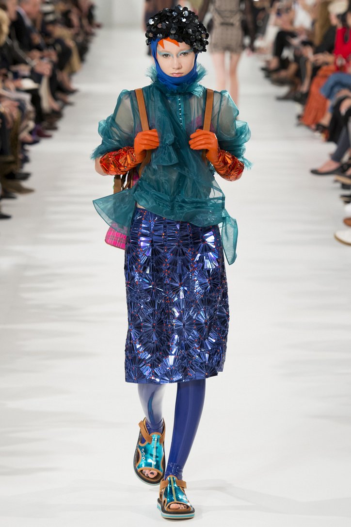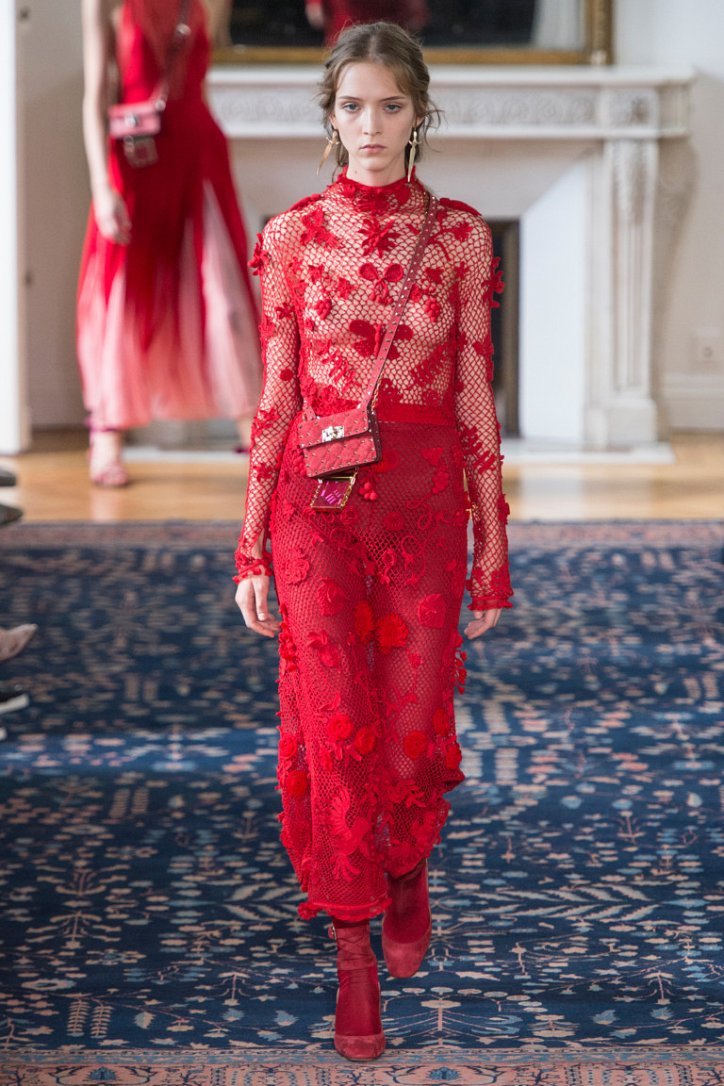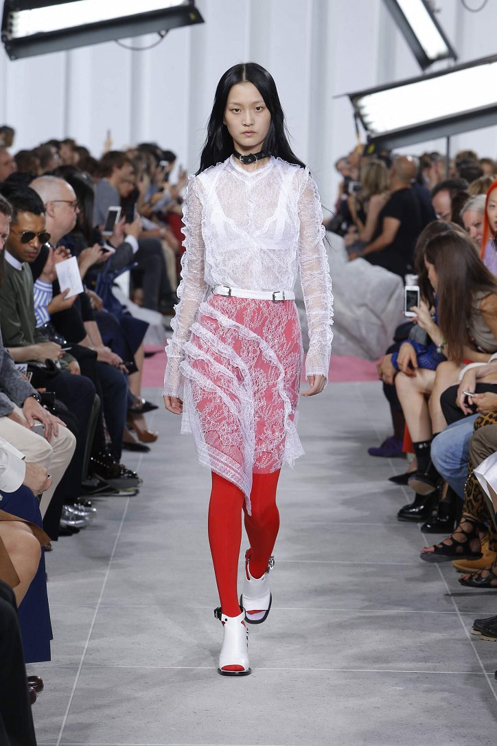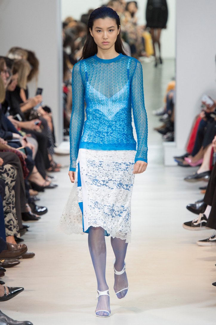 Впрочем, цветные колготки можно носить и в тон к одежде, поддерживая колористический монолук – как, например, красное платье из сетчатой ткани с красными же колготками в коллекции Valentino или синие полупрозрачные колготки, идеально дополняющие бело-голубой лук у Paco Rabanne.