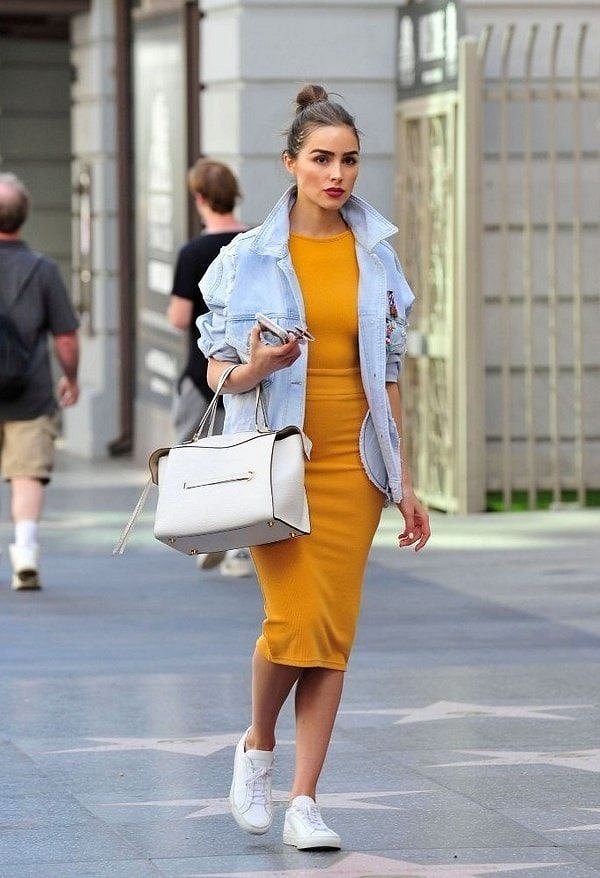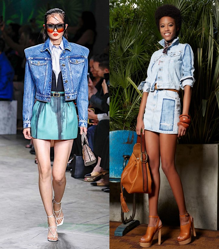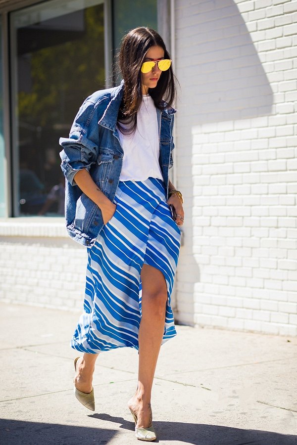Дерзко и кокетливо выглядит джинсовая куртка в паре с мини или миди юбкой с разрезом, коротким платьем или шортами.