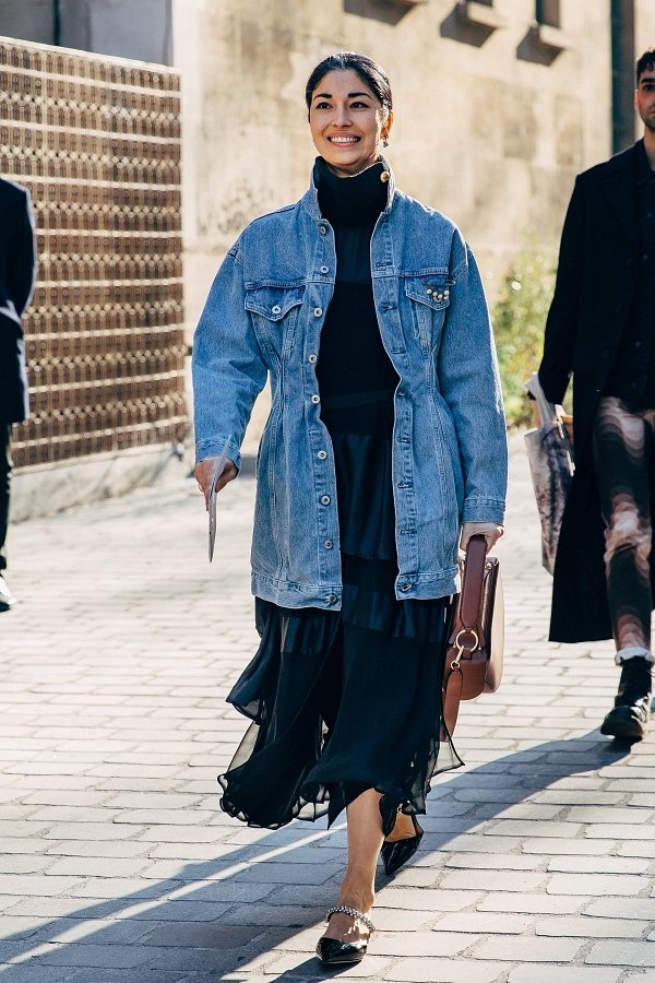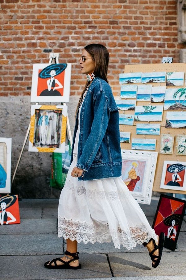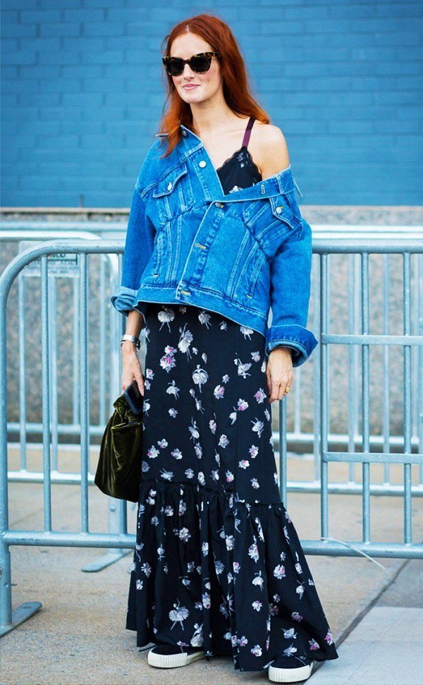 Если же вы предпочитаете романтический и женственный стиль одежды, примерьте куртку из денима с длинным платьем, сарафаном или юбкой – вещи из разных стилей помогут создать нежный, но, вместе с тем, стильный и оригинальный образ.