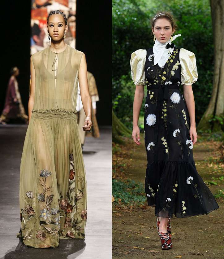 Вышитые и объёмные цветы – прекрасная альтернатива привычным цветочным принтам. Так, Erdem предлагает примерить эффектный черный сарафан, вышитый очень реалистичными веточками цветов, Valentino предложил вязаную модель с крупными бутонами роз на подоле, а Jenny Packham – потрясающий вечерний сарафан в греческом стиле с украшенным 3-D цветами лифом.
