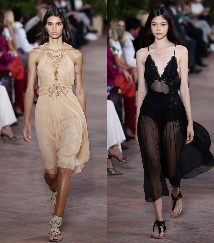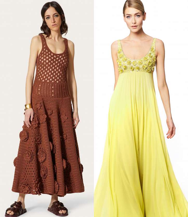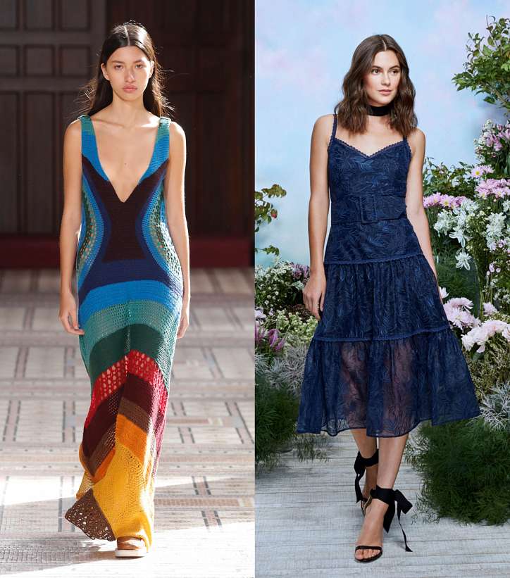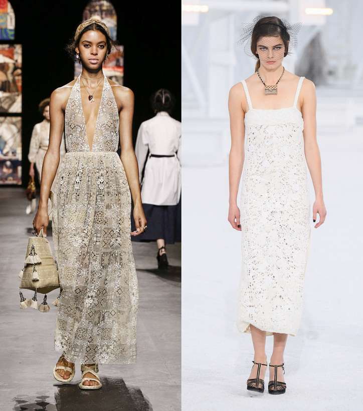 Кружево и макраме, «крючкотворчество» и вышивка «ришелье» украсили модные платья-сарафаны Chanel, Gabriela Hearst и Christian Dior. Ажурным может быть как вся модель, так и вставки (чаще всего – на боках).