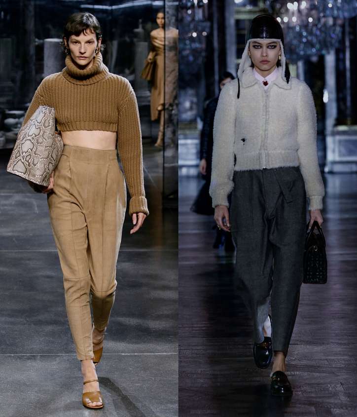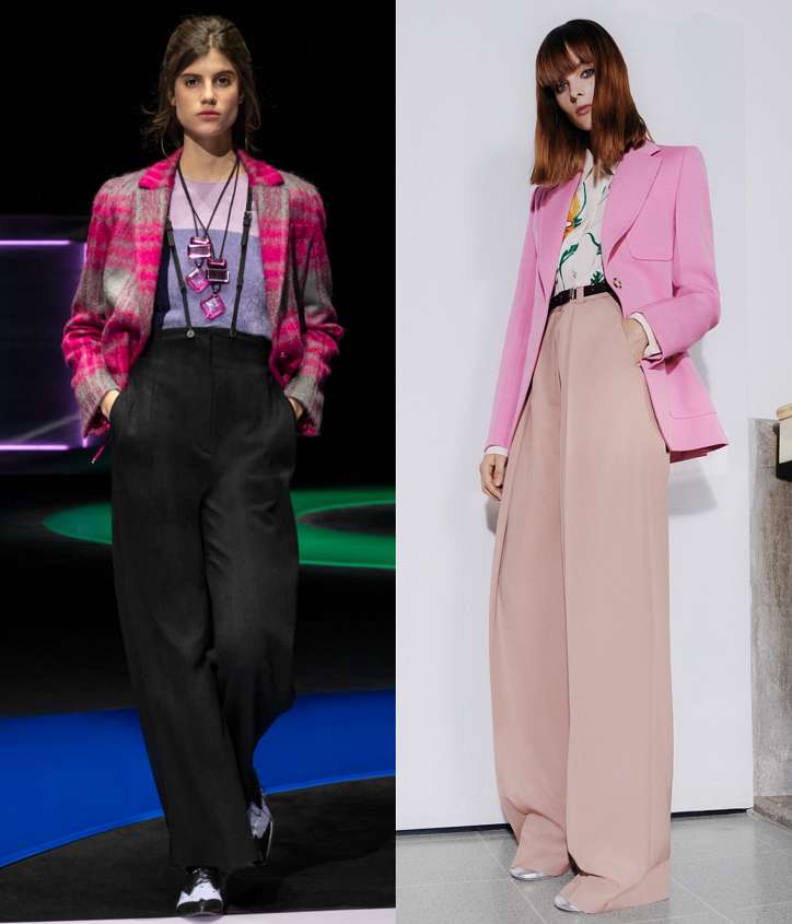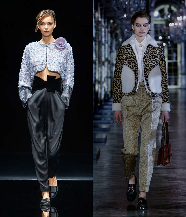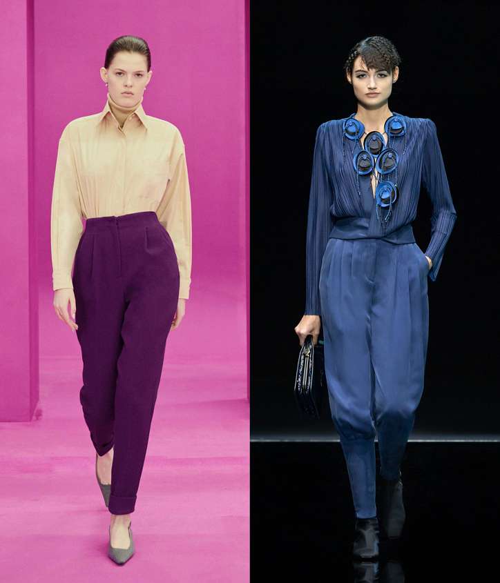 Ещё как минимум на сезон останутся в моде и брюки-бананы. Об этом свидетельствуют показы брендов Emilia Wickstead, Giorgio Armani, Fendi.