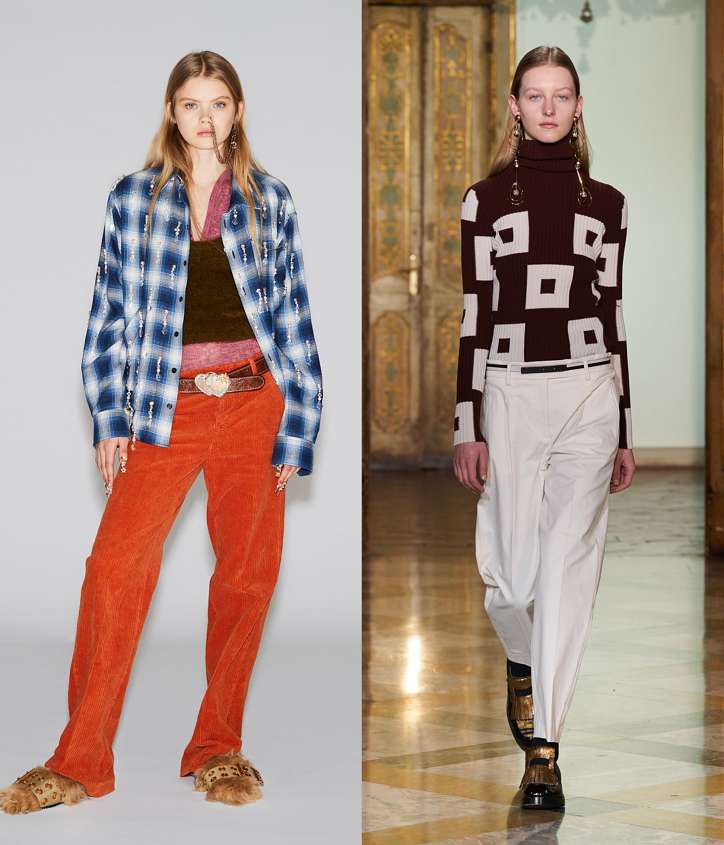 Классика на то и классика, чтобы быть всегда актуальной. Но прямой крой и стандартная посадка совсем не исключают трендовых нюансов. Так, Andrew Gn сочетает классический фасон с яркими оттенками, а Sportmax предлагает добавить брюкам длины.