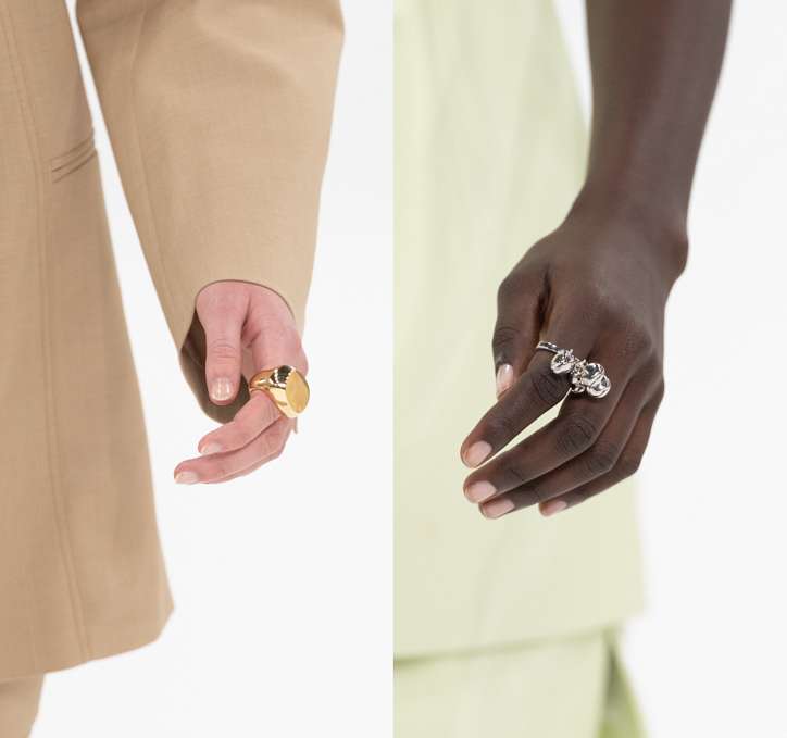 Кольца незаслуженно отошли на задний план ещё несколько сезонов назад. И в новых весенне-летних коллекциях мало что изменилось. Однако, выбрать все же есть из чего. Dior предлагает красочные «безделушки», Oma The Label – золотое кольцо-цепь, Erdem – модульные украшения с камнями.
