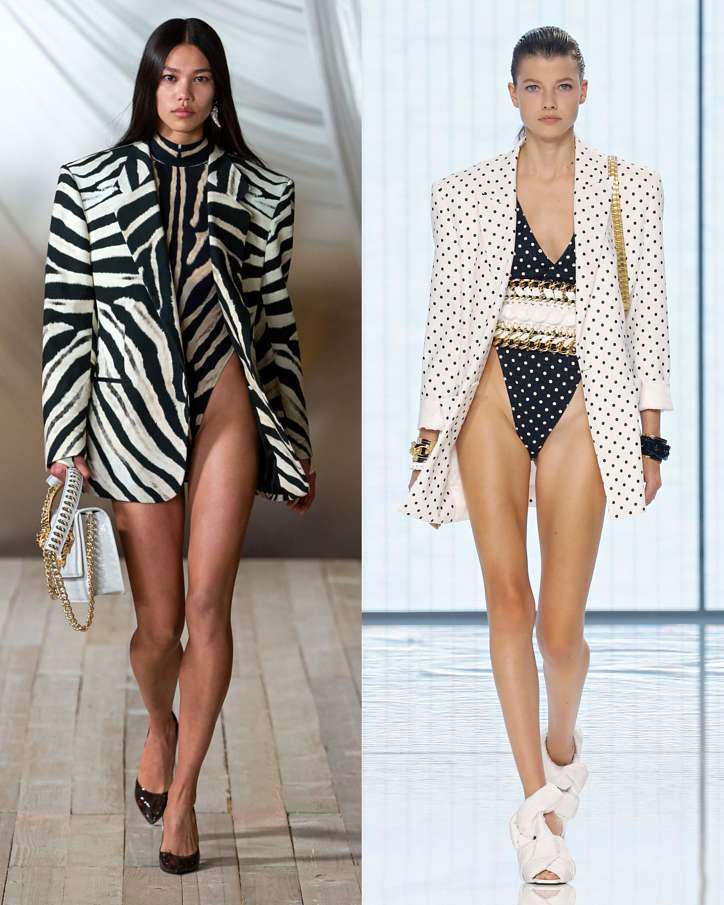 Блейзер или жакет длиной до середины бедра можно носить как самостоятельный элемент гардероба – без юбки или брюк. Это прекрасный вариант для перехода от дневного гардероба к вечернему, который станет достойной альтернативой коктейльному платью. Самые интересные модели модных жакетов, которые могут выступить в этой роли, – у Saint Laurent, Balmain и Roberto Cavalli.