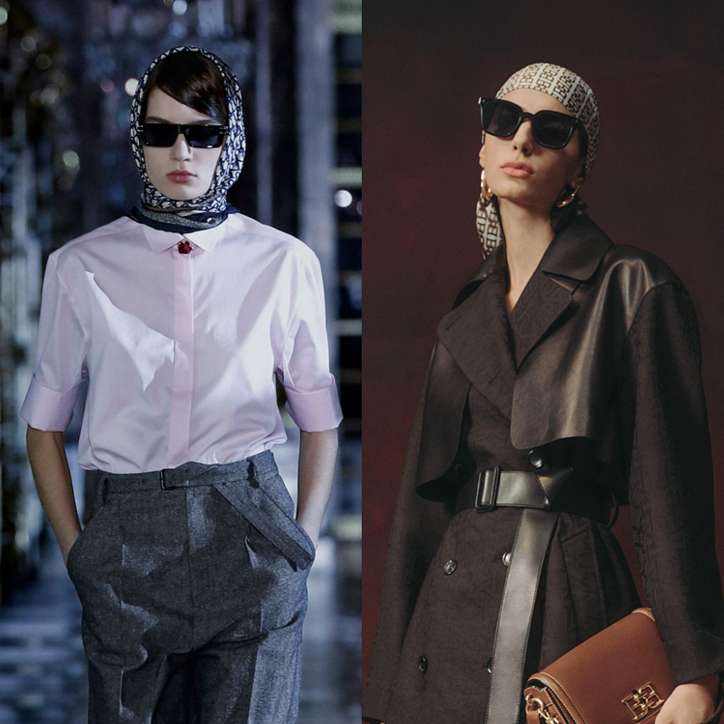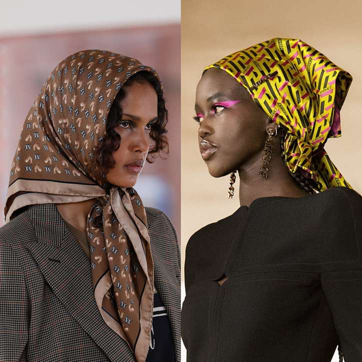 Идеальная альтернатива шапке или шляпе – платок или косынка. Дизайнеры Max Mara, Christian Dior, Versace обыгрывали этот тренд на все лады: завязывали шёлковые косынки на манер банданы и в «бабушкином» стиле, предлагали носить их в паре со шляпой и примерить экстравагантный меховой вариант.