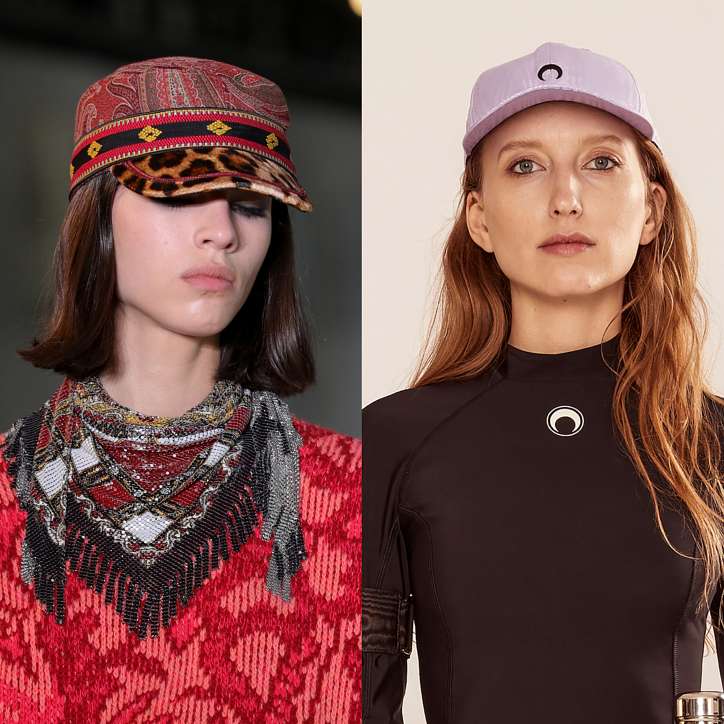 Актуальны в этом сезоне будут и кепки. Они придадут образу немного дерзости и озорства. Как и с чем носить этот головной убор, подскажут Etro, Marine Serre и Celine.