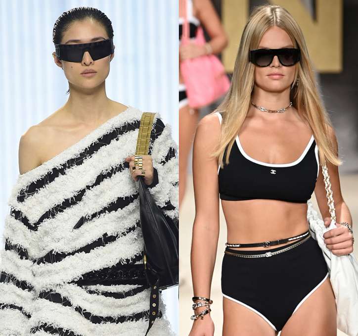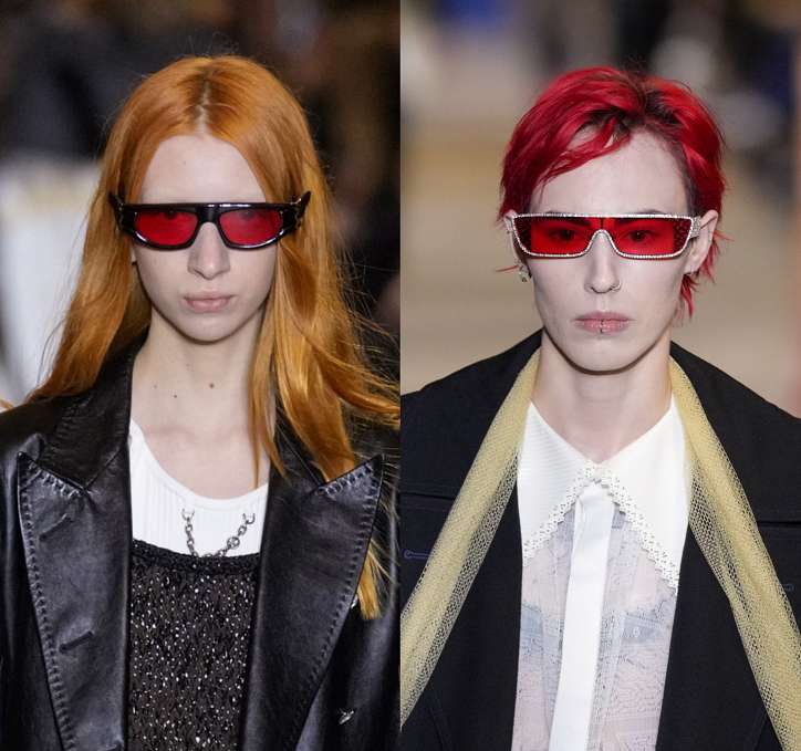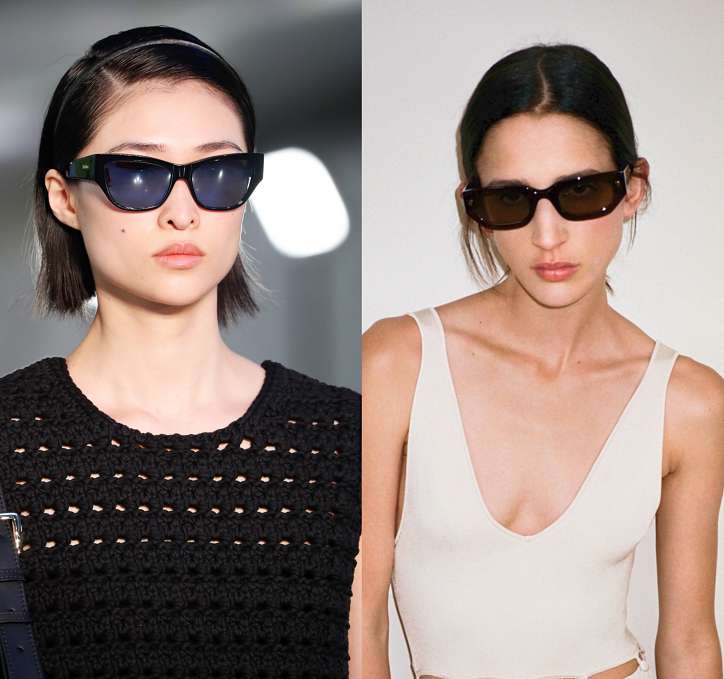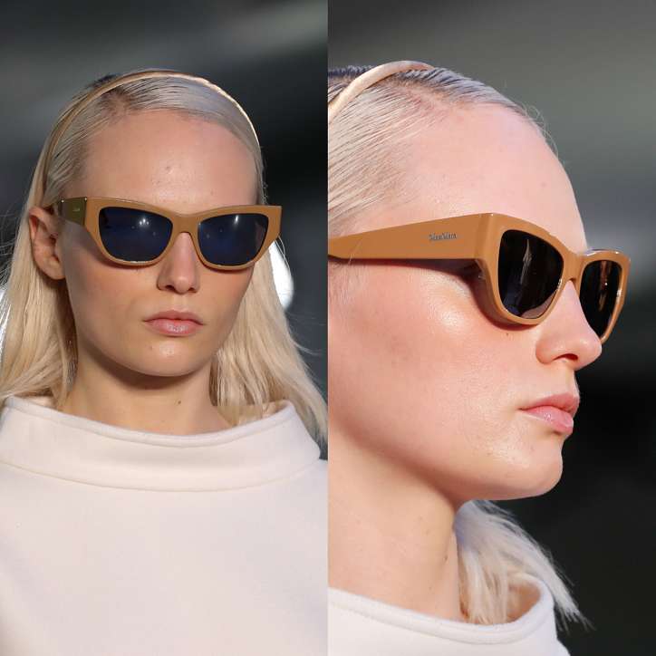 Узкие вытянутые очки прямоугольной или овальной формы – один из самых актуальных трендов. Подобные женские солнцезащитные очки в 2023 году предлагают носить дизайнеры брендов Max Mara, Louis Vuitton и Nanushka.