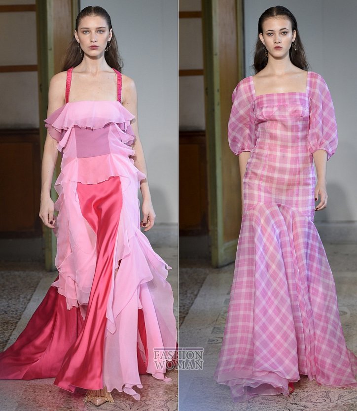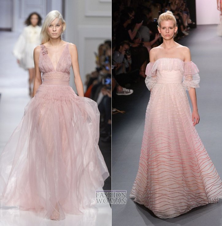 Для тех, кто считает, что с ног до головы одеться в розовое – это уже чересчур, дизайнеры предлагают слегка «разбавить» образ нейтральными цветами – белым, бежевым или черным (Andrew Gn, Zac Posen, Blumarine).