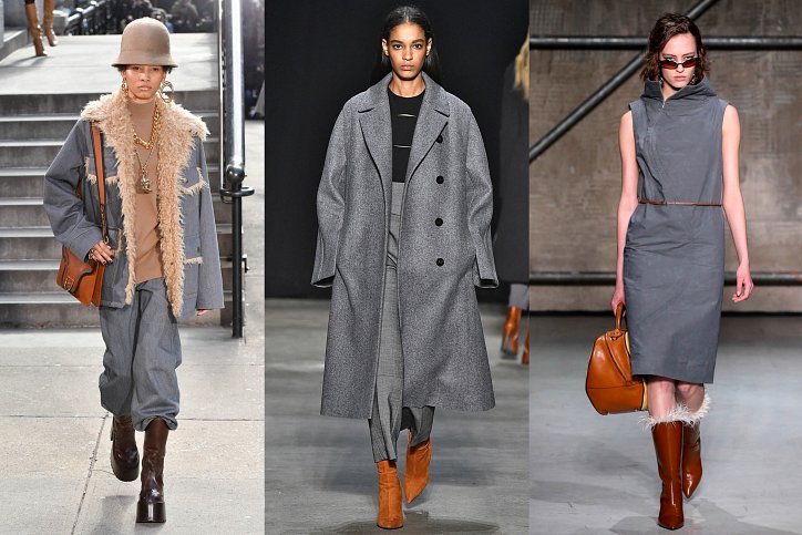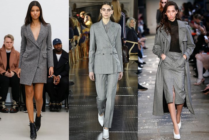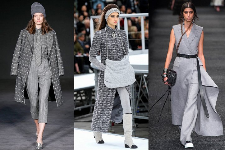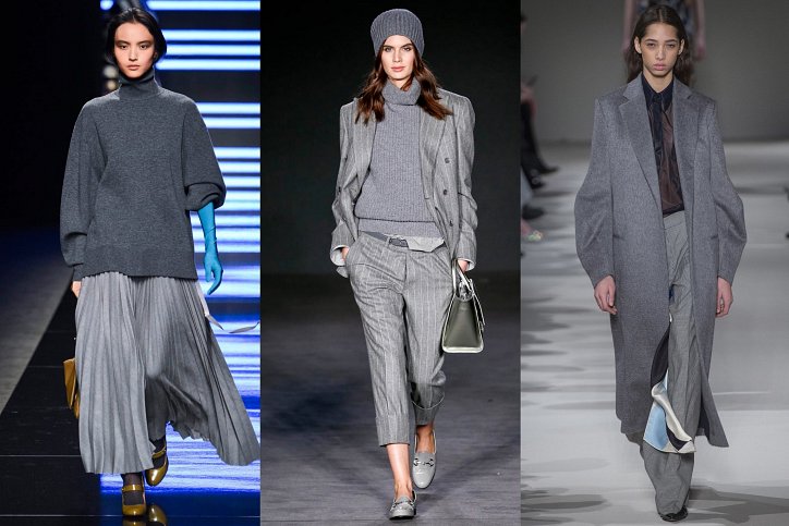 В сезоне осень-зима 2017-2018 «правит балом» нейтральный серый цвет, который стабильно держится в топе модных цветов последние несколько лет. Он символизирует дождливую и холодную погоду осенне-зимнего периода: серое пасмурное небо, мокрый асфальт, дождливое утро и первые ночные заморозки. Серый цвет в одежде менее мрачный, но не менее элегантный и практичный, чем черный. В этом сезоне особо актуальны будут серые пальто, платья, брюки, трикотаж и аксессуары.