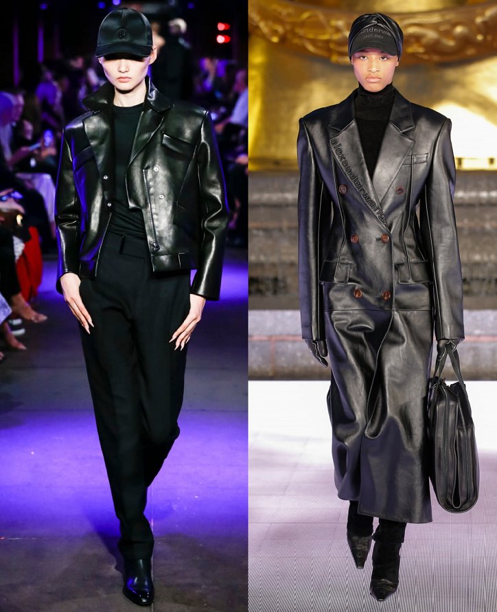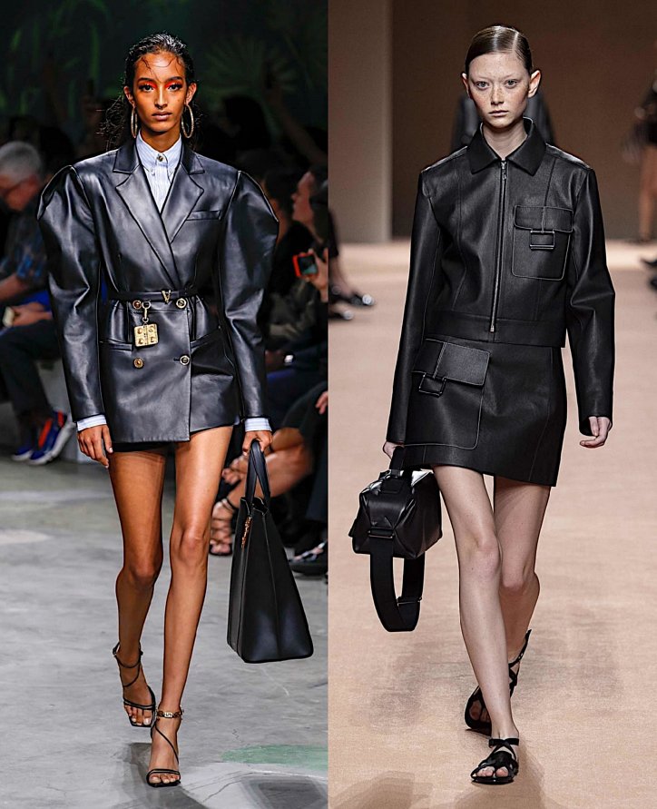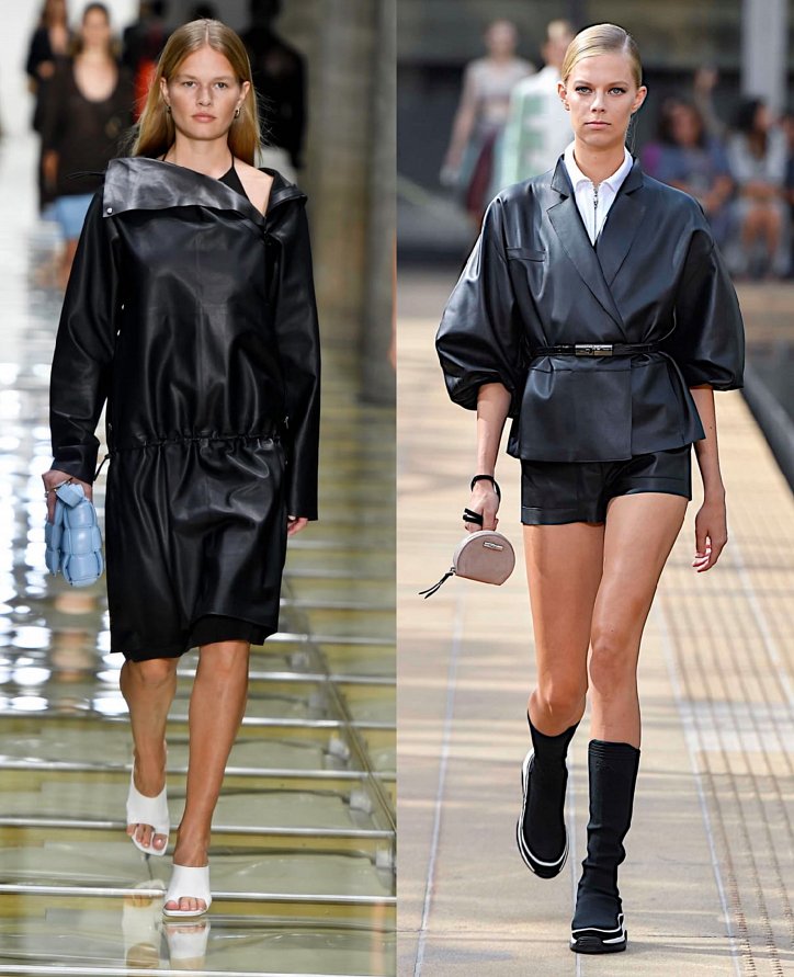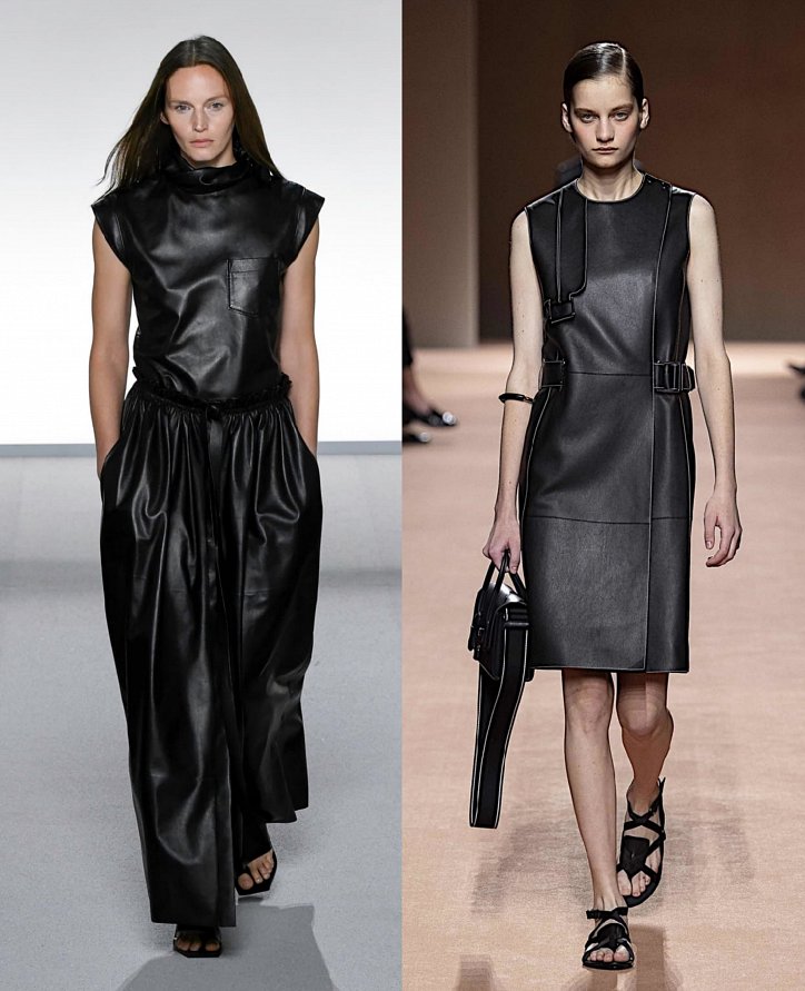Впрочем, текстура кожи будет зависеть от того, в каком изделии используется этот материал. Если это брутальные байкерские косухи или бомберы как у пилотов-авиаторов, то тут можно выбирать более грубую и плотную кожу. Если это брючные костюмы или платья, то можно использовать и мягкую лайковую кожу, которая облегает силуэт. Подобные наряды мы увидели на подиумах у дизайнеров Bottega Veneta и Longchamp.