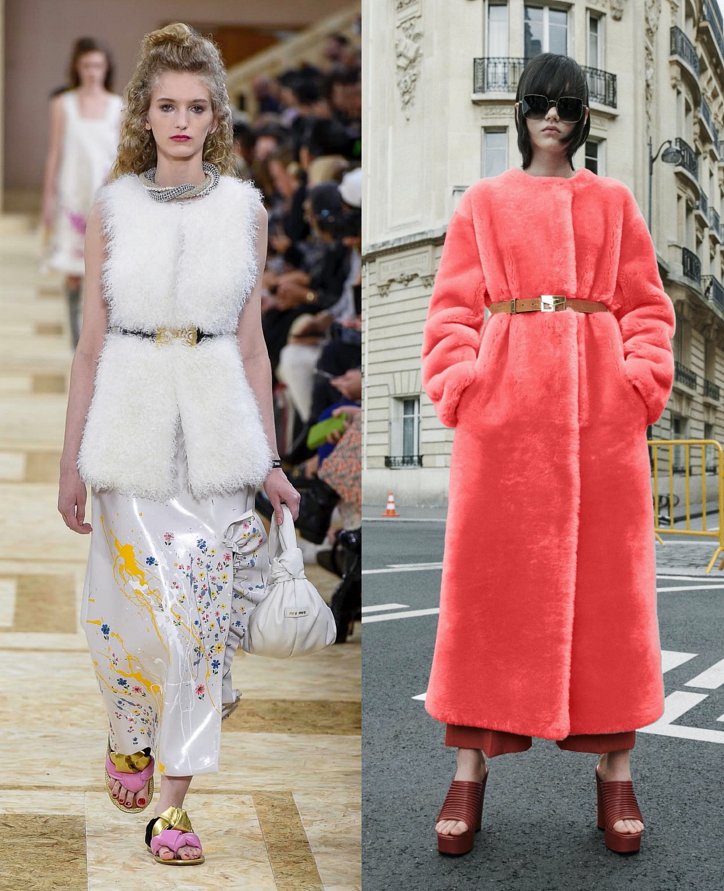 Из искусственного меха может шиться не только верхняя одежда, хотя она, конечно же, будет в приоритете. Выбирайте также красивые объемные свитера, жакеты и кардиганы, например, как у Celine и Miu Miu. А из верхней одежды можно выбирать как длинные пальто в пол, так и короткие плюшевые шубки. Жилетки, как короткие, так и удлиненные тоже могут быть вариантом для теплого времени года.