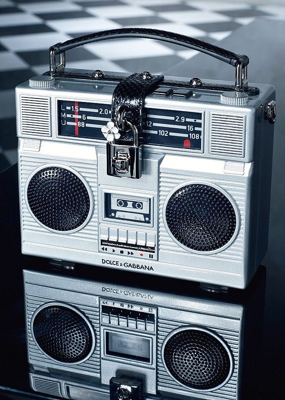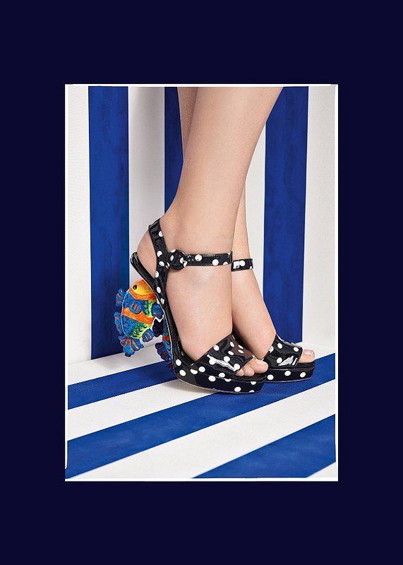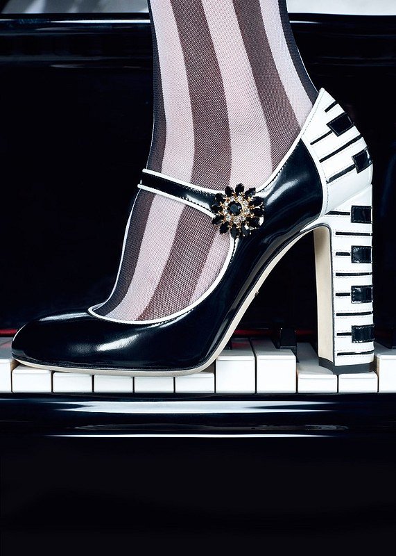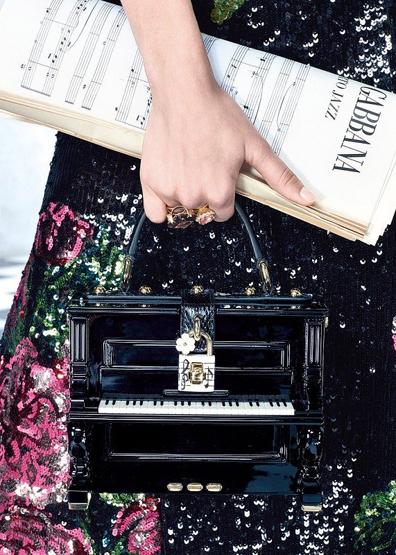 Дополняют тему тропиков аксессуары в музыкальной тематике. Здесь и сумка в виде портативного кассетного магнитофона, и туфли украшенные изображением клавиш, и саквояж-пианино.