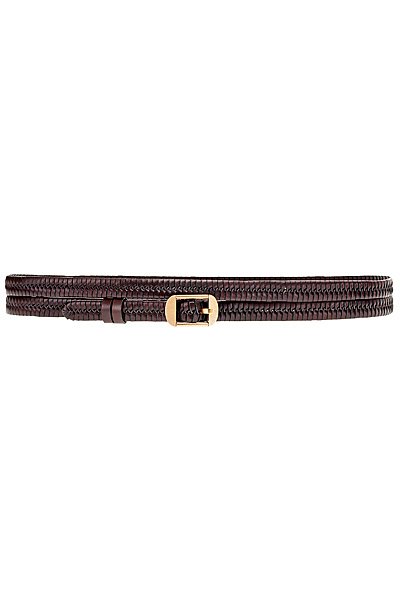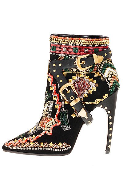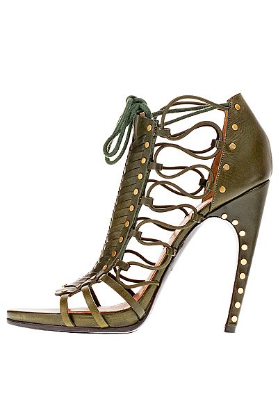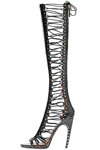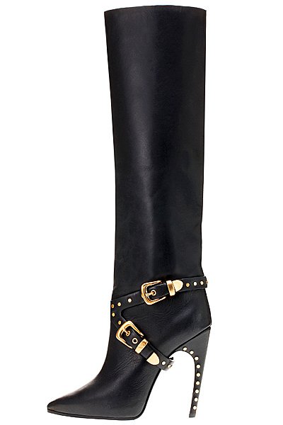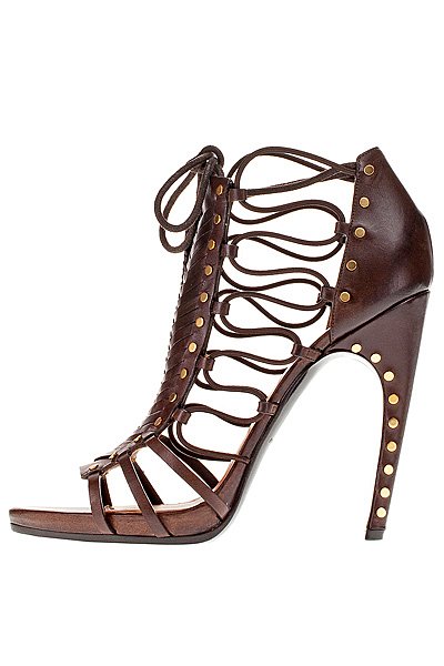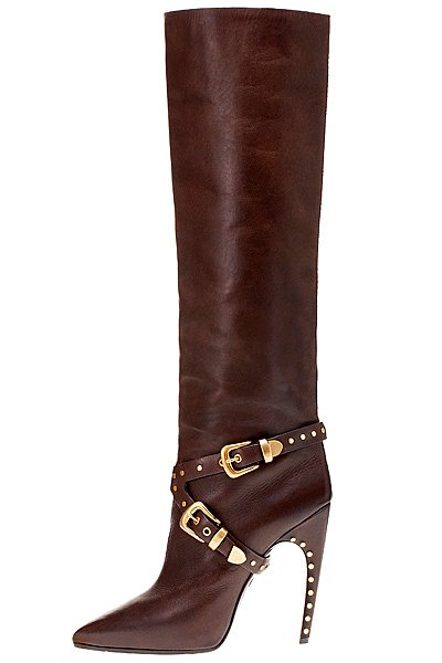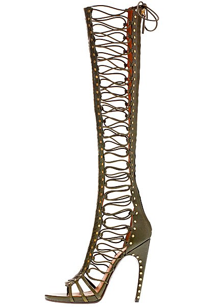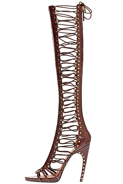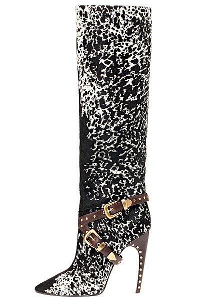 Особое место в коллекции занимают высокие сапоги и сандалии на изящной «подогнутой» шпильке, выполненные в «гладиаторском» стиле. Цвета – самые модные: бордо, кипарис и, конечно же, традиционные черный и коричневый. Вторая «серия» обуви – сапоги из принтованной оленьей кожи и однотонные модели, украшенные ремешками.