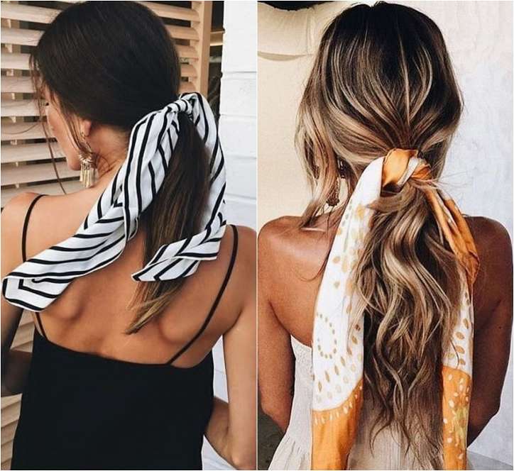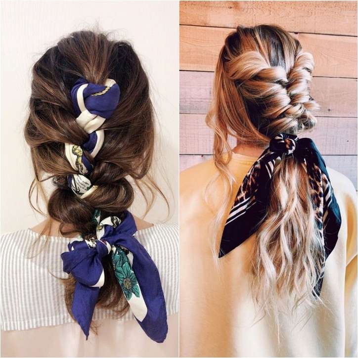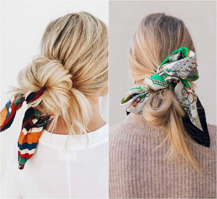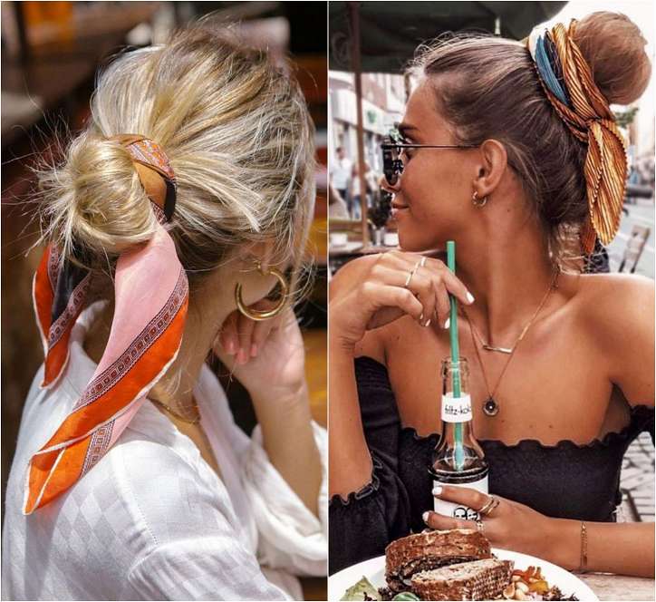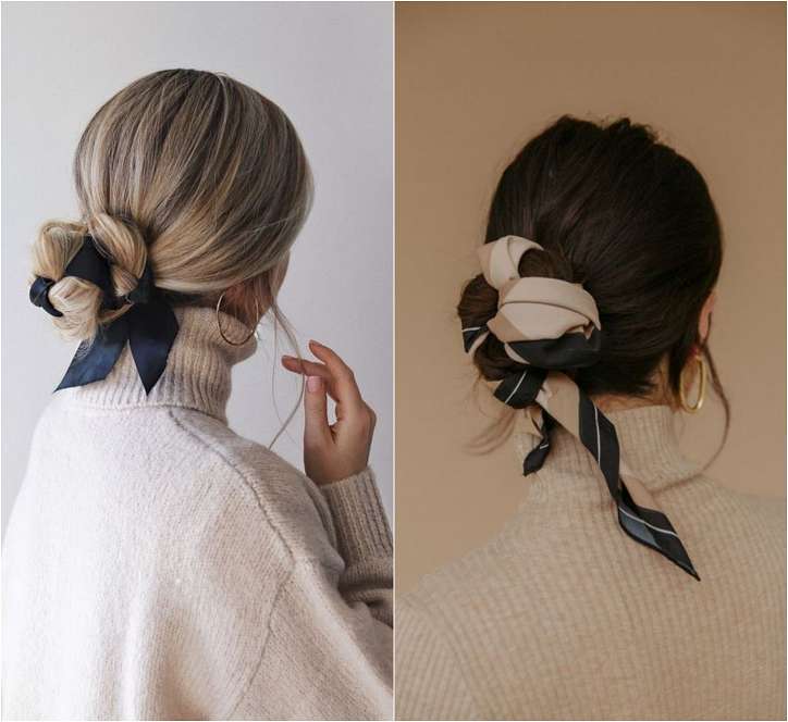 Кроме того, вы можете смело носить платок в волосах: повяжите его на хвост или вплетите в косу. Также можно собрать волосы в пучок, аккуратно обвязав его платком.