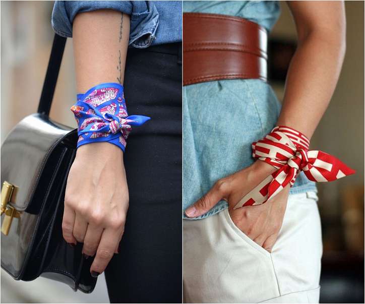 Интересный и не банальный способ внедрить в свой образ шелковый платок - это обернуть его вокруг запястья и завязать бант.